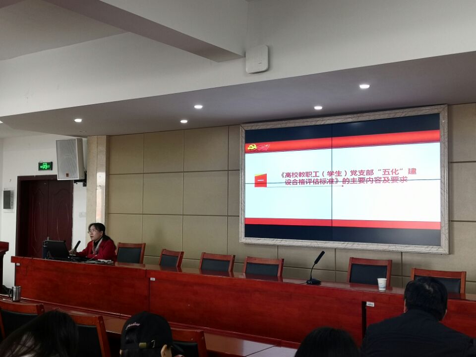 推进党支部“五化”建设是对我们党重视基层党组织建设这一优良传统的继承,是贯彻落实习近平新时代中国特色社会主义思想和党的十九大精神的重要举措。为了进一步推进公司党支部“五化”建设的进度,提升党支部的组织力、突出党支部政治功能,2019年3月19日下午,公司党委请“概论”教研部党支部书记杨松菊博士在立言楼A5-1报告厅为全院师生党员上了一堂题为《高校教职工/员工党支部‘五化’建设合格评估标准解读》的党课。