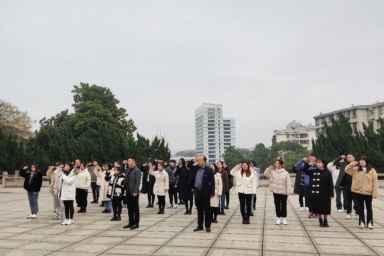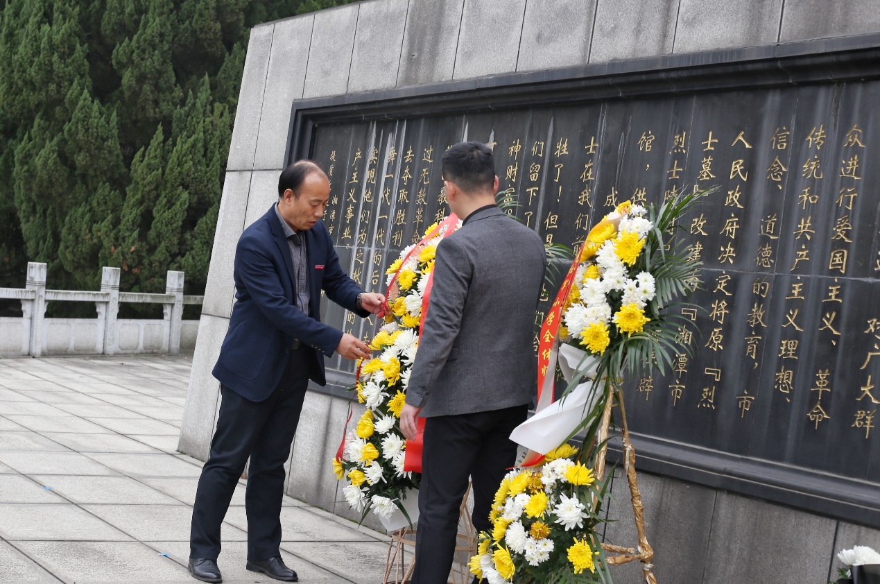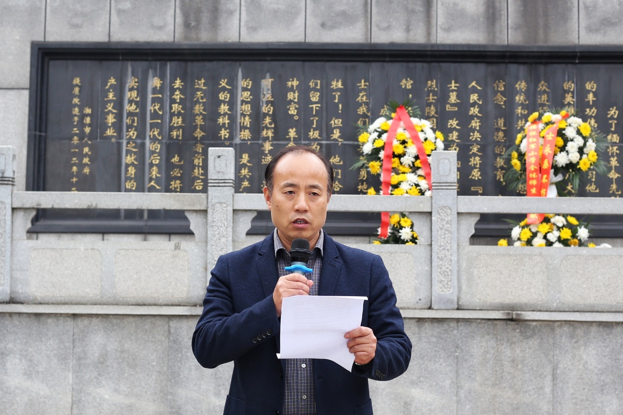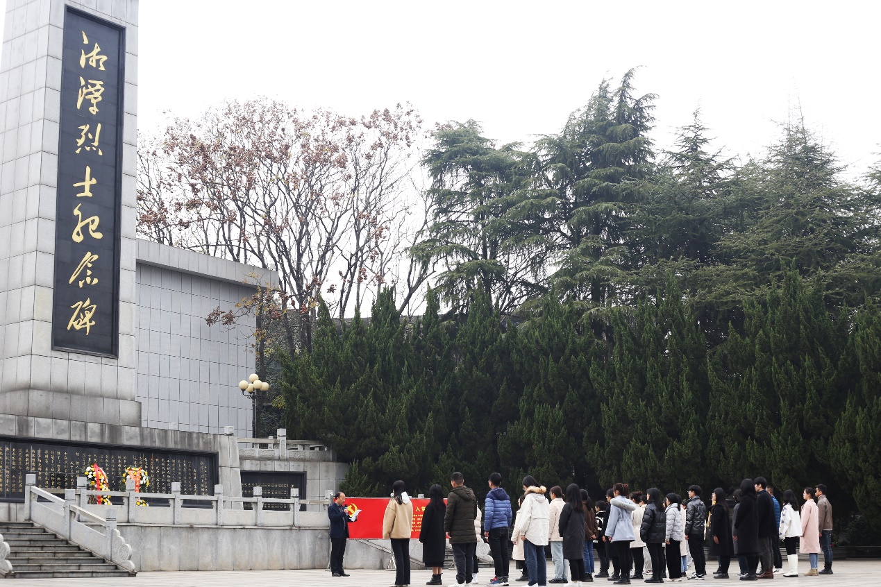 仪式在国歌声中正式开始,全体师生面向烈士纪念碑列队肃立、默哀,现场气氛庄严肃穆。接着由两位党员员工代表护送花篮走向烈士纪念碑,刘图其副书记与刘哲老师共同上前仔细整理花篮缎带,以表达对革命先烈的深切缅怀之情。随后,刘图其副书记做了《勿忘国耻,牢记使命,争做堪当民族复兴重任的时代新人》的讲话,强调今天我们缅怀先烈,就是要时刻铭记历史、牢记使命,以革命先烈为榜样,大力弘扬爱国主义精神、忠于人民精神、无私奉献精神和敢于牺牲的精神,努力学习,争做堪当民族复兴重任的时代新人。全体党员于纪念碑下重温入党誓词,进行庄严宣誓,以示忠于党和人民之心与报国之志。宣誓完毕后,全体人员依次从左往右绕纪念碑缓步而行,走过英烈墙,追思革命先烈的丰功伟绩。