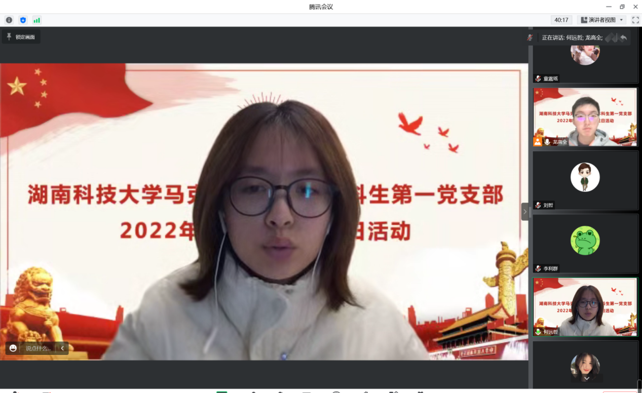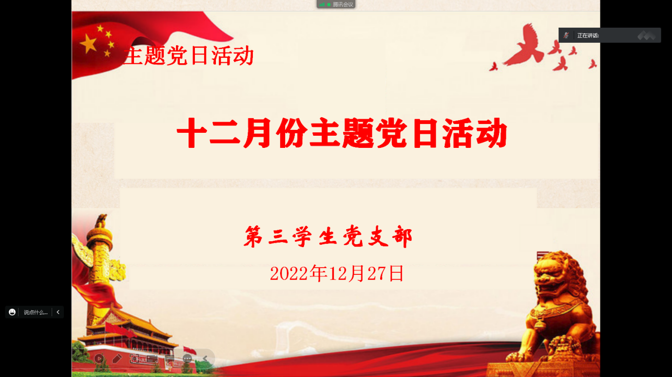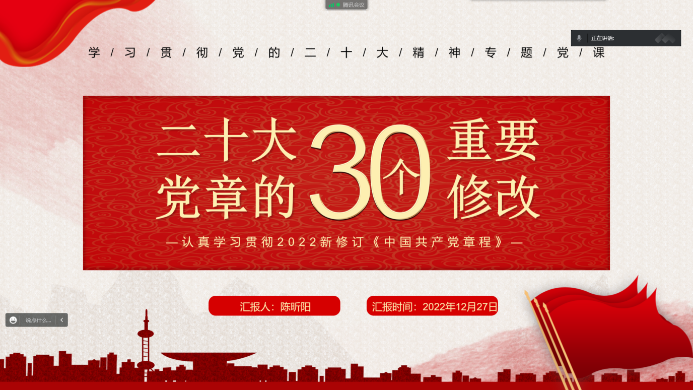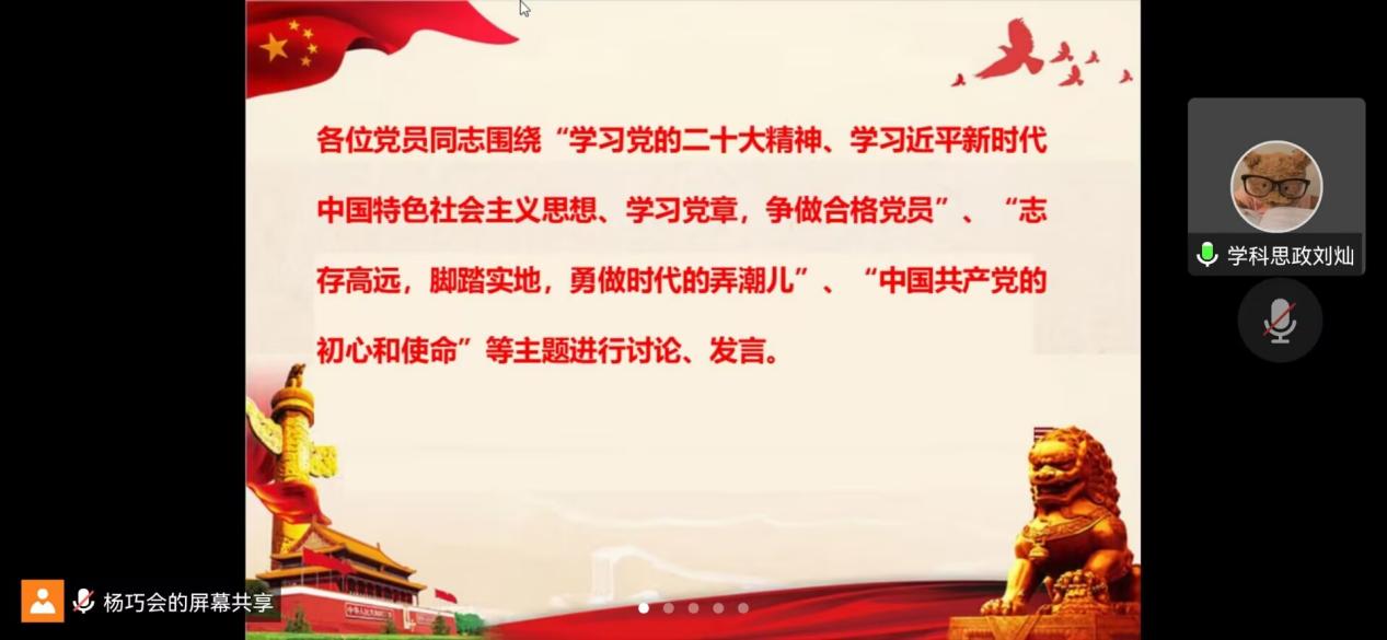 为深刻领会党的二十大精神内涵,理解党章修订的核心要义,学习优秀共产党员的先进事迹,增强青年党员的使命担当,12月27日,公司本科生第一党支部、研究生第二、三、四、五党支部及下属昭潭书院校区党小组分别召开“一课一片一实践”系列活动暨12月主题党日活动。鉴于疫情防控需要,此次活动采取线上方式进行,各员工党支部全体党员参会。