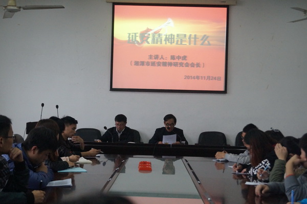 应公司延安精神研究会的邀请,湘潭市延安精神研究会陈中虎会长于11月24日下午在十教506会议室作了“延安精神是什么”的报告,报告会由304永利集团延安精神研究会副会长吴克明教授主持。公司延安精神研究会全体员工会员、毛泽东邓小平理论学习研究会代表、思想政治教育专业本科生代表参加了报告会。同时出席宣讲的还有湘潭市延安精神研究会陈德阴秘书长。