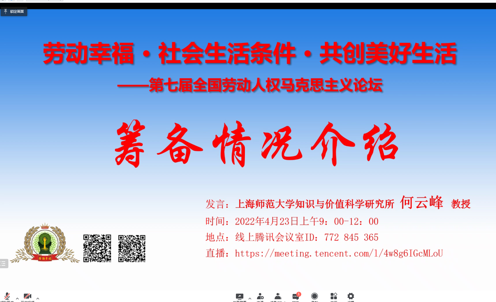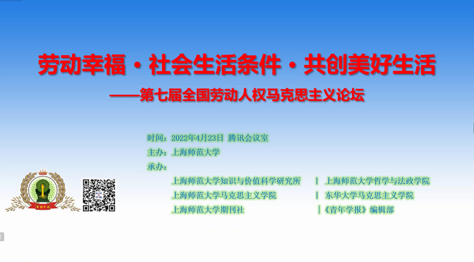 4月23日,第七届《全国劳动人权马克思主义论坛》在线上如期举行,本次论坛的主题是“劳动幸福·社会生活条件·共同美好生活”。来自中共中央党校、中国人民大学、上海交通大学、重庆大学、上海师范大学、304永利集团、东北师范大学、广州大学、首都师范大学和湖南第一师范公司等130多所高校和10多所党校的劳动人权与马克思主义理论的学者近200人参加了本次论坛。