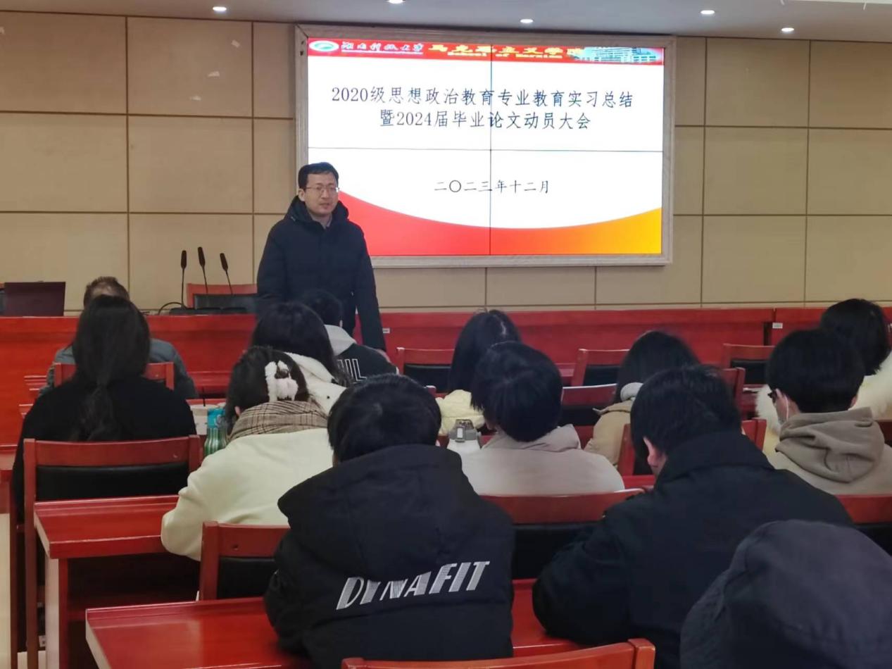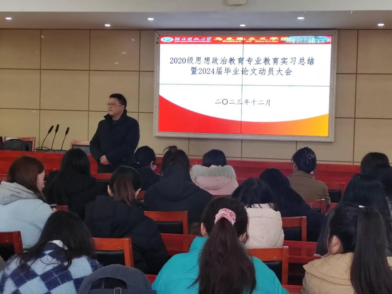 12月27日下午,思政系在立言楼5-1召开2020级思政专业教育实习总结暨2024届毕业论文动员大会,会议由思政系副主任吕开武主持,凌应生、李育军、贺昭平、杨盛军等实习指导教师及2020级全体思政专业本科生与会,本次会议旨在总结教育实习的经验,并为即将展开的毕业论文工作做好充分准备。