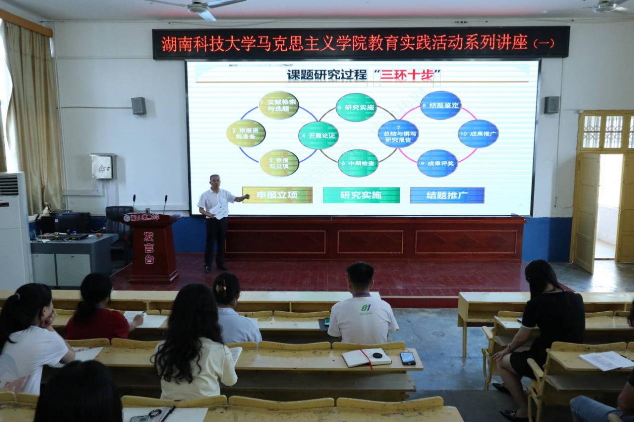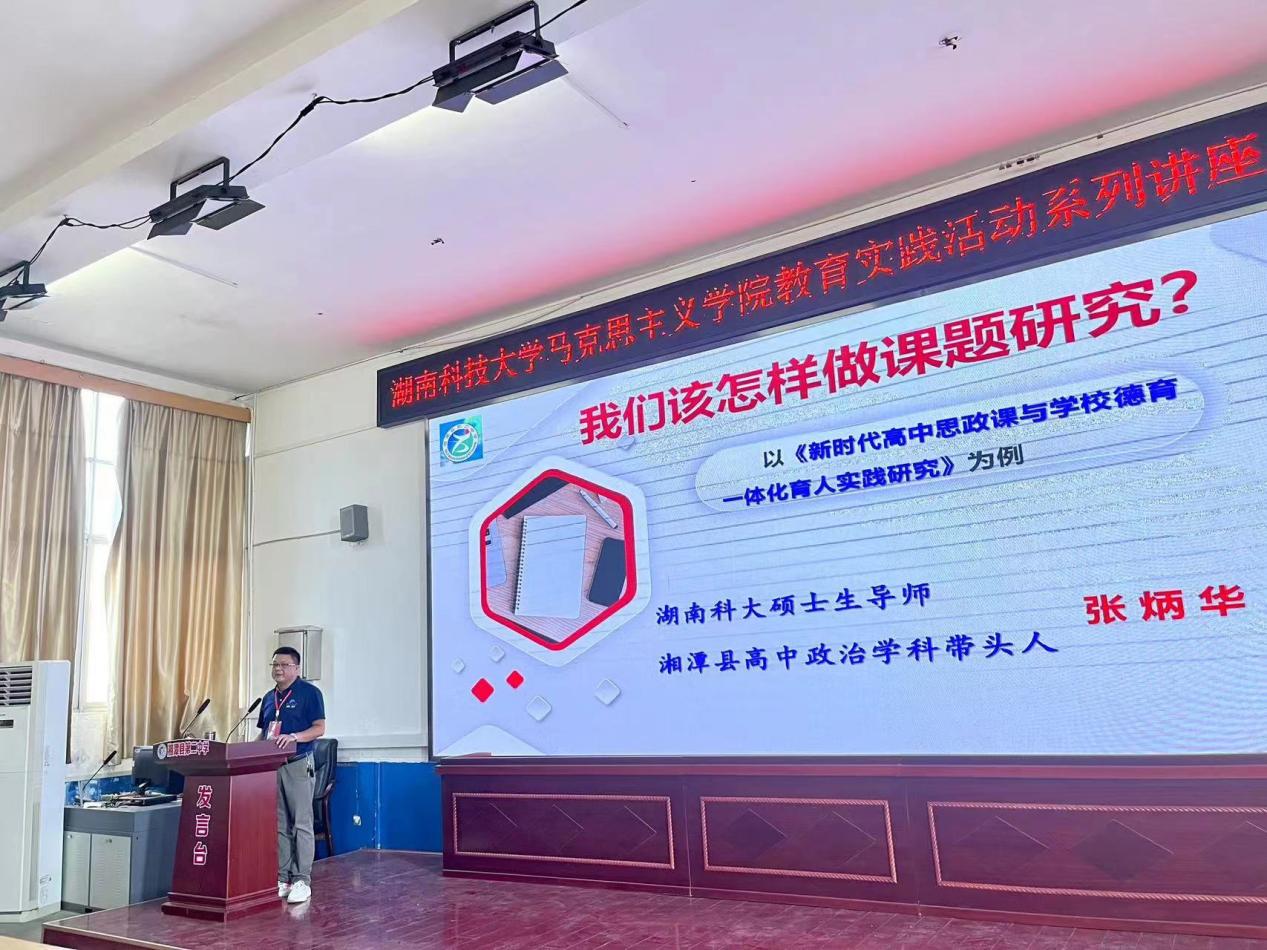 提升教师的教育科研能力、专业化素养,是扎实推动教育强国建设的题中之义。9月20日上午,304永利集团304永利集团“思政大讲堂”第11期暨“大中小学思政课一体化建设”系列讲座第1讲,以“我们该怎样做课题研究?——以省教育科学规划课题《新时代高中思政课与公司德育一体化育人实践研究》为例”为主题,在湘潭县二中精彩开讲。本次讲堂由湖南科大硕士生导师、湘潭县高中政治学科带头人张炳华老师主讲,湖南科大马院实习带队教师李育军博士主持。湖南科大全体实习教师、湘潭县二中思政教研组全体成员及部分教师参加。