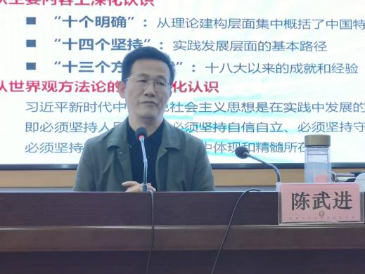 10月20日上午,由湘潭县中小学教研室中学思政教研员陈武进老师主讲的“廓开视野,科学实施《读本》课程——聚焦《习近平新时代中国特色社会主义思想员工读本(初中)》”的专题讲座在湘潭江声实验学校会议室开展。本次讲座由侯周文董事长主持,2022级思想政治教育专业江声实习队全体成员参会。