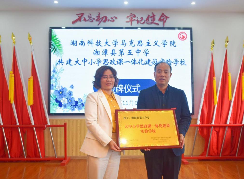 梁迎新首先致欢迎辞,肯定了公司员工在实习阶段的表现,并对两校“大中小学思政课一体化建设”提出以下几点建议:一要发挥好思政队伍建设、员工培育、高校引领和立德树人作用;二要落实好党中央关于思政课建设的重要精神;三要不断探索思政课改革发展路径、强化思政课育人理念、提高思政课教学水平。紧接着,公司实习生代表周心雨在发言中对于湘潭县第五中学提供的实习平台表示诚挚谢意,并表示自己在老师指导下提升了教学能力,积累了管理经验,收获颇丰。刘图其代表马院为梁迎新董事长颁发“大中小学思政课一体化建设”顾问聘书,并授予湘潭县五中“‘薪火湘传’宣讲基地”和“大中小学思政课一体化建设实验公司”匾牌。同时,刘图其对县五中全体老师为公司实习生提供全面周到的服务和悉心的指导致以诚挚的感谢,并提出:希望两校以授牌为契机,进一步加强两校交流合作,共同努力,在教学育人、团队培养、资源对接及思政课建设等方面取得新的突破,结出新的硕果。