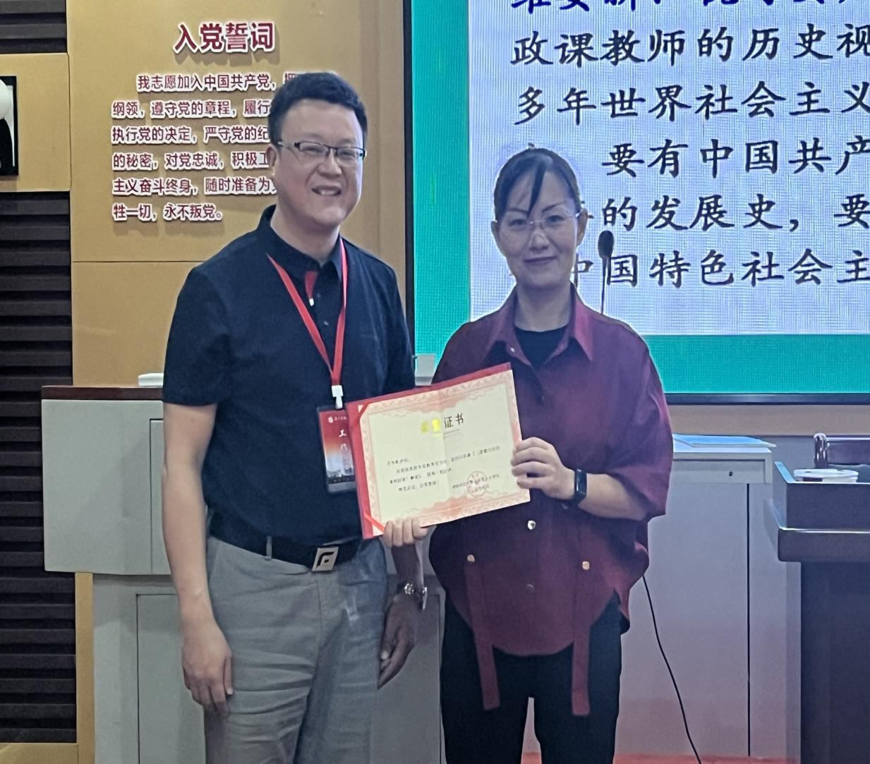 实习队员们全神贯注地听课,认真细致地做好记录。课程结束后,带队教师李育军博士为肖争乾老师颁发了荣誉证书,随后,大家与肖老师一起合影留念,记录下这难忘的时刻。实习队员们纷纷表示,肖争乾老师深入浅出的课标解读,为他们后续开展教学实习工作提供了清晰的指引和有力的支持。在今后的教学实践中,他们将积极把所学内容转化为实际教学能力,努力设计出既符合素养导向又贴合员工需求的道德与法治课程,为培养新时代的优秀员工贡献自己的力量。