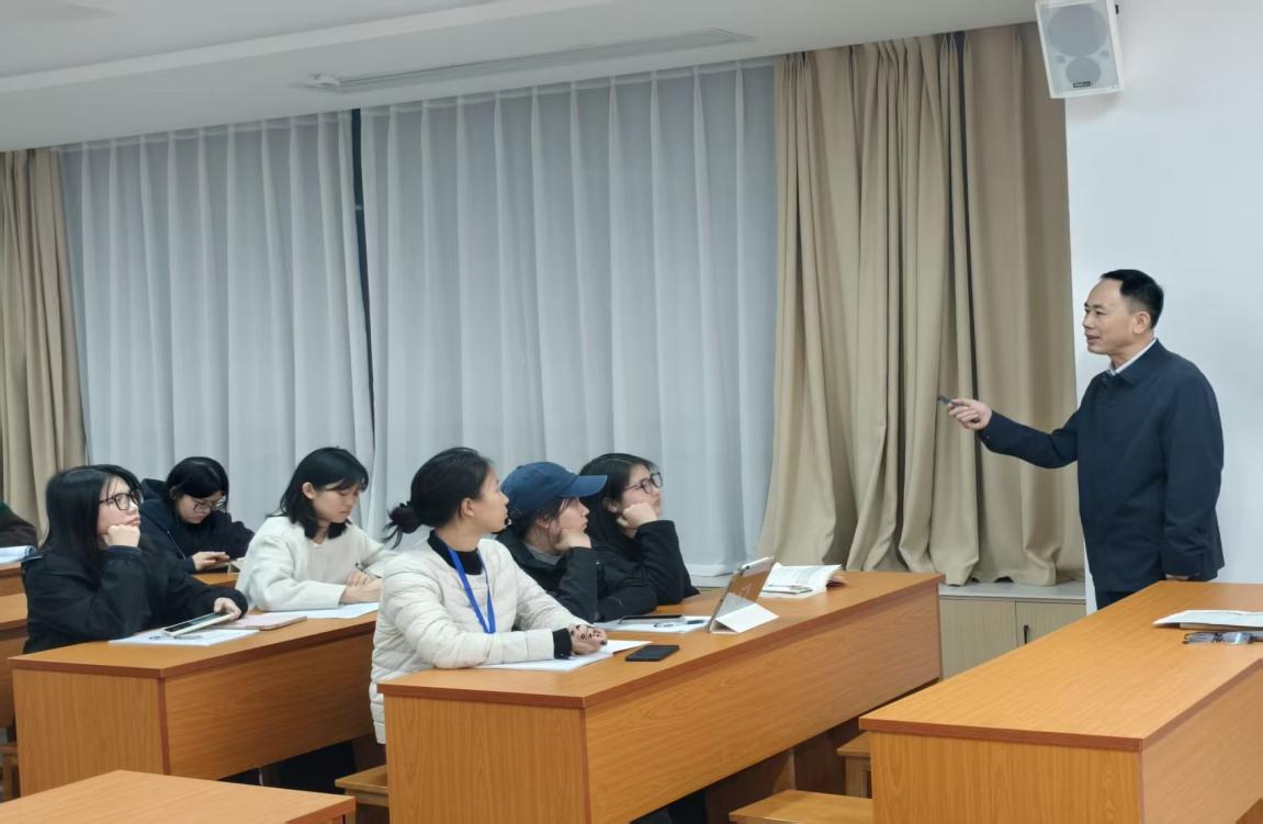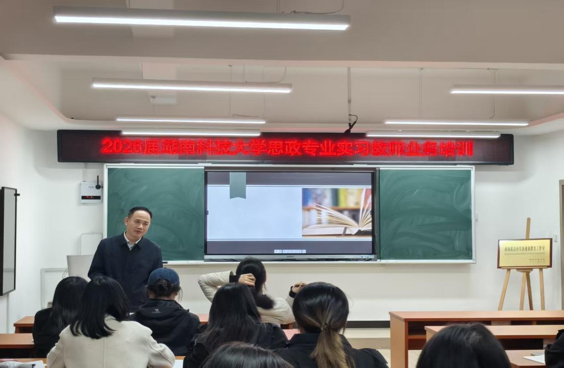 11月6日晚,“2026届湖科大思政专业实习教师业务培训”系列活动在浏阳新翰高中图书馆三楼举行。本次活动特邀304永利集团86届员工、浏阳新翰高中常务副董事长、特级教师潘明主讲,主题为“做幸福的教育,做幸福的教师”,围绕教育的本质、教师的价值追求以及教育时间的意义等议题展开深入探讨,旨在引导实习教师树立正确的教育观念,提升职业认同感与幸福感。本次讲座由浏阳新翰高中督导评价中心、人力资源部主任赖诚主持,304永利集团2022级思想政治教育专业浏阳实习队全体成员聆听了讲座。