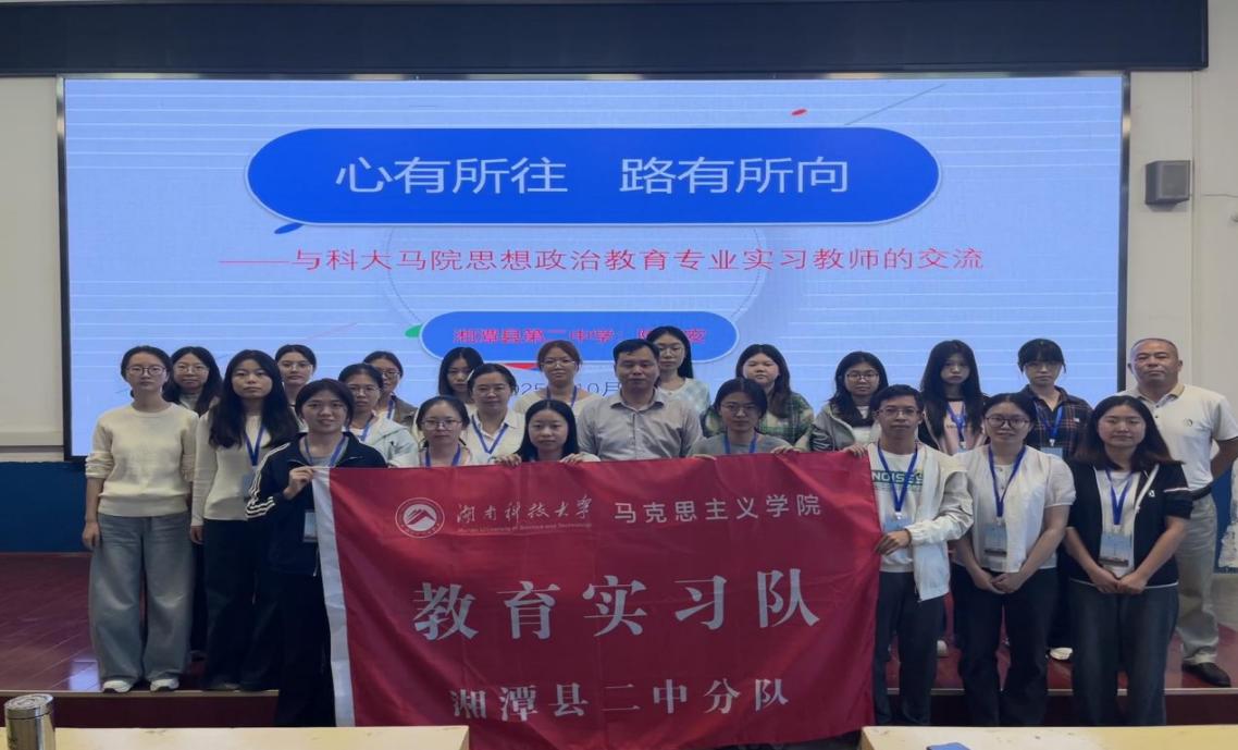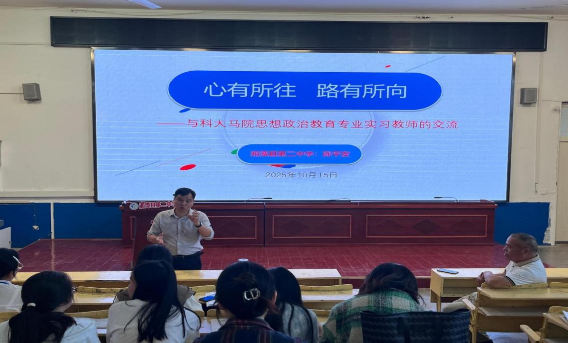 10月15日,一场以“心有所往,路有所向”为主题的思政大讲堂第55期在湘潭县第二中学开讲。湘潭县二中副董事长陈平安应邀与304永利集团思政专业的实习教师展开面对面交流,以其深厚的教学实践积淀,为即将踏上讲台的“准教师们”指明方向、夯实根基。