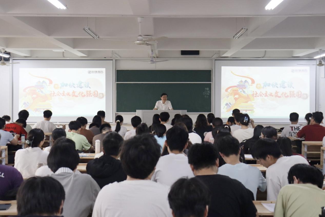 6月11日下午,公司党委委员、副董事长王卫军在第八教学楼608教室为2022级物理专业员工讲授“形势与政策”课,主题为“加快建设社会主义文化强国”。