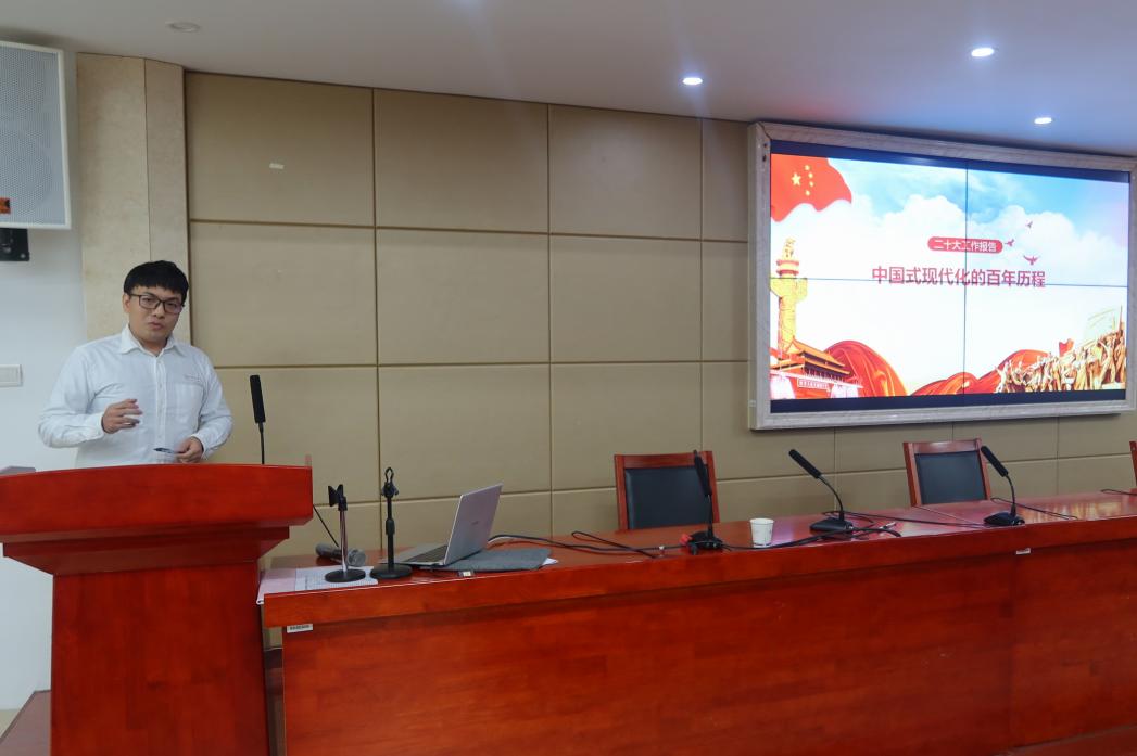 随后,“薪火湘传”宣讲团徐浩彬作了题为《聚焦二十大,筑梦新征程》的宣讲。他以二十大报告中的关键词为切入点,带领全员回顾了二十大报告的内容,分析了党章新修订的内容要点,并从百年历程、超越逻辑、国内外影响三个维度深入解读了“中国式现代化”。