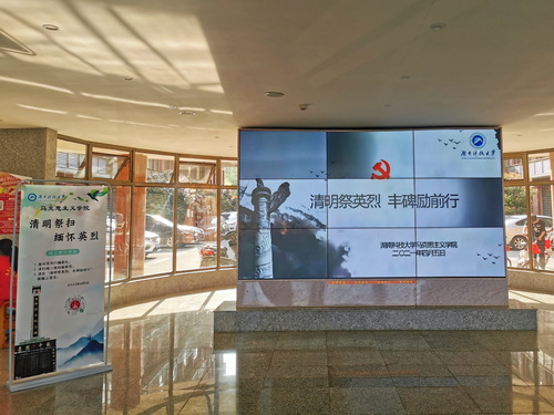 然后,与会师生向烈士默哀,行鞠躬礼,通过“云端扫码”向烈士进献鲜花,以寄托对革命烈士的无限哀思,表达对革命烈士的无限敬仰与怀念之情。最后,与会师生移步一楼大厅,在“清明祭英烈、丰碑励前行”的横幅上签字署名,以激励自己不忘初心,牢记使命,赓续奋斗,并于立言楼前合影。
