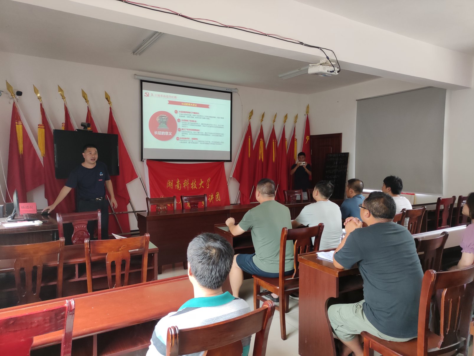 廖双红在石壁村开展了《从脱贫攻坚看人民至上》的理论宣讲。结合通道县”用美丽战胜贫困“的特色脱贫之路和重要成就,阐释了中国共产党根基在人民、血脉在人民、力量在人民,这场宣讲让基层党员干部更加深刻地理解了中国共产党员的责任担当,他们纷纷表示要在”村企合一“模式中坚定维护人民利益,在推进基层组织现代化治理转变过程中更好的服务人民群众。彭立春在中团村村部进行了《从乡村巨变看党的百年辉煌成就》的理论宣讲,紧密结合通道县乡村社会、经济、文化的历史发展,阐释了中国共产党百年来为了实现中华民族伟大复兴的艰苦奋斗历程及重大成就,从救国、兴国、富国、强国四个阶段简述了新民主主义革命、社会主义革命、社会主义现代化建设和新时代中国特色社会主义的伟大历史成就,介绍了中国共产党取得重大成就的历史经验和重要启示,彭博士精彩有趣的演讲增强了党员干部的责任感和使命感,激励着党员干部不断奋进。
