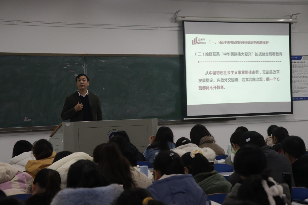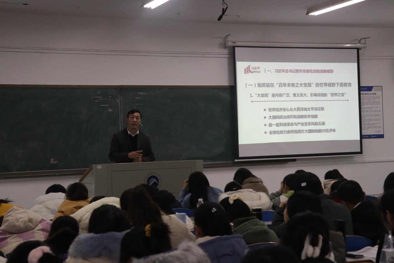 刘书记主要围绕“深入学习理解习近平总书记教育重要论述”的主题展开,以《习近平总书记教育重要论述讲义》一书为引,首先向同学们介绍了在党的十八大以来,习近平总书记立足世界发展大势和国家发展全局,着眼民族复兴伟大梦想,围绕中国教育发展作出了一系列重要讲话,形成了习近平总书记关于教育的重要论述。从习近平总书记教育重要论述的战略视野出发,刘书记强调了教育的重要性,只有当今的员工接受了正确的教育和观念体系,才能实现国家的长续性发展。他举了香港问题这一例子,由于香港政府没有牢牢掌握教育意识形态话语权,导致香港人民的意识形态和文化方面出了问题,有力论证了教育是国之大计、党之大计。