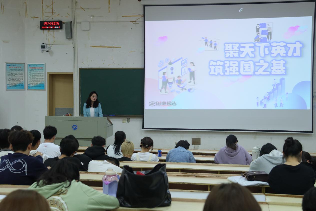 2023年5月24日第九、十节课,公司党委委员、副董事长谢慧在第五教学楼1-3教室以“聚天下英才,筑强国之基”为主题,给21财管、会计、土木共6个班的同学们讲授了“形势与政策”课。
