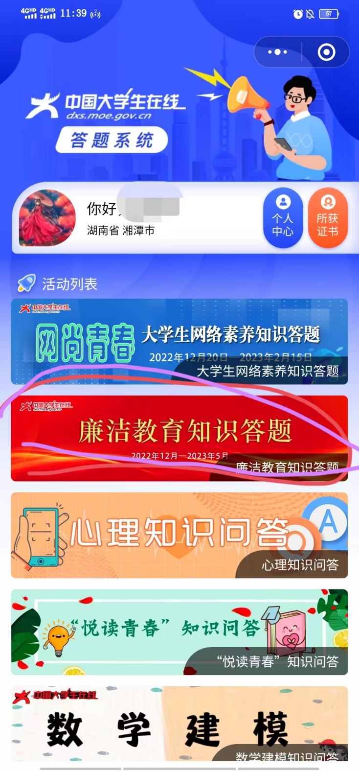 第四步,输入信息后,点击“廉洁教育知识答题”。