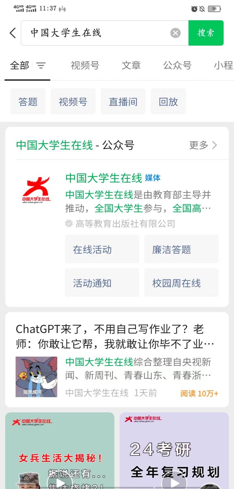第一步,打开“微信”搜索框,搜索“中国老员工在线”,关注并进入对话框。