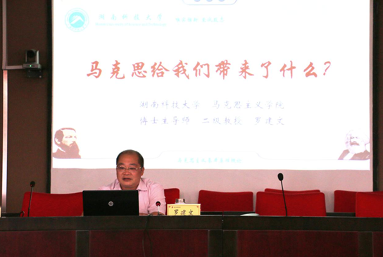罗建文教授围绕“我们为什么要隆重纪念马克思”、“马克思给我们带来了什么”、“马克思主义的真理力量和方法论在哪里”、“马克思主义究竟是什么样的思想体系”等问题展开了本次专题讲座的主要内容。首先,罗建文教授向大家介绍了马克思光辉的一生和战斗的一生,提出了深入学习马克思主义思想精髓的三个维度;从马克思主义的组成部分、马克思恩格斯如何创立了马克思主义、马克思主义三大组成部分的不同历史作用等方面为大家讲解了“马克思给我们带来了什么”;重点讲授了如何深刻理解和准确把握《共产党宣言》的思想内涵,如何根据中国社会发展历史来把握“马克思主义的真理力量和方法论”等等;最后,罗建文教授就如何学习马克思主义理论,如何增强共产党人的“看家本领”讲了自己的看法。他指出:唯有高度的党性自觉才能永葆共产党人的政治本色不变质不褪色,并向大家分享了自己的心得体会:“党员干部尤其要注意自警、自省、自重、自励,加强自我教育、自我修养、自我约束和自我完善,提高反腐拒变的免疫力,坚持防微杜渐,要堂堂正正做人、清清白白做官、踏踏实实做事。”