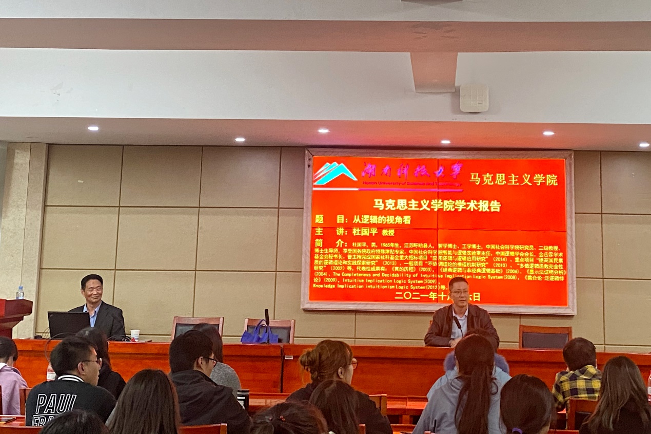 10月16日晚7点30分,中国社会科公司智能与逻辑实验室主任、中国逻辑学会会长、金岳霖学术基金会秘书长杜国平教授应邀来公司作题为“从逻辑的视角看”的学术报告。报告会在304永利集团立言楼A5-1报告厅举行,由公司颜中军老师主持,公司部分专业教师和在校硕士、博士研究生积极参与并聆听了此次报告。