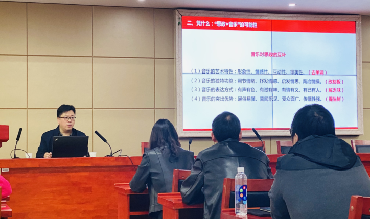 胡艺华教授的讲座分为两个部分:第一部分是“思政+音乐”教学案例展示,第二部分是阐述“思政+音乐”教学模式理念。在第一部分教学展示中,胡教授通过四首歌曲将每个知识点衔接贯穿起来,引人思索、激发情感、调动气氛,在“有声有色”的教学中以情动人、以情感人,在“有滋有味”的教学中讲解道理、阐释理论,在“有情有义”的教学中给人以启迪、发人以思考。第二部分,胡教授主要从四个方面阐述了他对“思政+音乐”教学模式的探索。首先,他指出“思政+音乐”的必要性,一是打通思政课与专业课之间壁垒的迫切需要,二是遵循艺术类老员工成长规律的必然要求,三是提升思政课亲和力与吸引力的现实需要。其次,他分析了“为什么‘思政+音乐’课可以实现”:正是因为音乐与思政相互融通性、音乐对思政的互补,音乐才能深度融入思政教学,才能使思政课去单调、改刻板、解乏味、提生鲜,才能融通历史与现实、沟通教师与员工、唤醒员工的心灵、激起员工的热血。其次,胡教授解读了“思政+音乐”的基本内涵,即理论传播与音乐表达的协同精进、理论内容与音乐形式的内在统一、理论逻辑与音乐资源的相互融合、理论自觉与音乐互动的有机兼容。最后,他指出,“思政+音乐”课堂应注意的问题,音乐不能喧宾夺主、哗众取宠而是为思政课堂赋能、加芯、助力。整堂讲座胡教授充满激情,抑扬顿挫,给予全体师生一场视听盛宴,让人流连忘返,回味无穷。