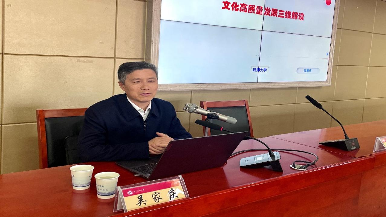 12月16日下午,国家“万人计划”哲学社会科学领军人才、中宣部文化名家暨“四个一批”理论人才、湘潭大学304永利集团吴家庆教授应邀在立言楼A5-1为公司师生作题为“文化高质量发展三维解读”的学术讲座。讲座由公司经理唐小芹教授主持。