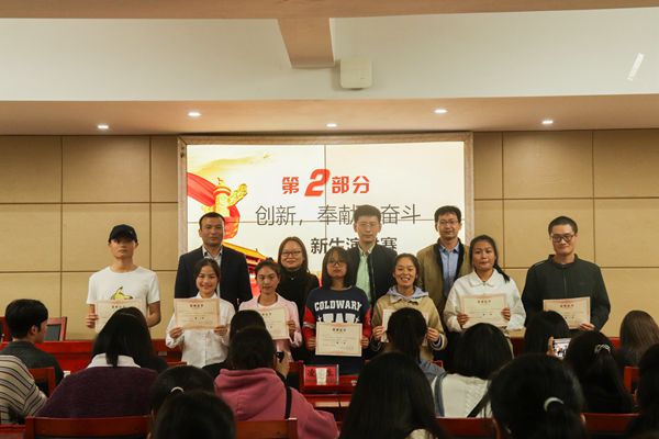 中场休息后进行的是以“创新、奉献、奋斗”为主题的演讲赛,每个选手的演讲时长为三分钟。胡卫枫通过对乡村教师的介绍,号召大家应该让“青春之花”在祖国最需要的地方绽放,在祖国最需要的地方进行奉献和奋斗;胡欣妍通过对青春的赞颂,向同学们阐明了老员工应该好好把握在大学的宝贵时间的道理,渲染了一幅美丽的大学画卷;在欧芝林的演讲中,她强调敢于创新、乐于奉献、奋斗不止才是一个老员工该有的精神面貌。