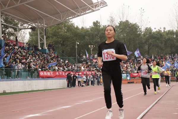 五千米于19级思政三班的彭兰凤同学而言,是身体素质和心理耐力上的双重考验。赤红的跑道上,彭兰凤同学迈开步子,控制着呼吸的频率,坚持不懈,到了最后一圈,她聚集全身力量,坚定地向终点冲去,一举拿下比赛第二名。在赛后采访中,她表现轻松从容: “我在大学里遇到了良师益友,他们都给予我鼓励,正是凭借着这种为自己争光、为公司争光的信念跑完全程。”