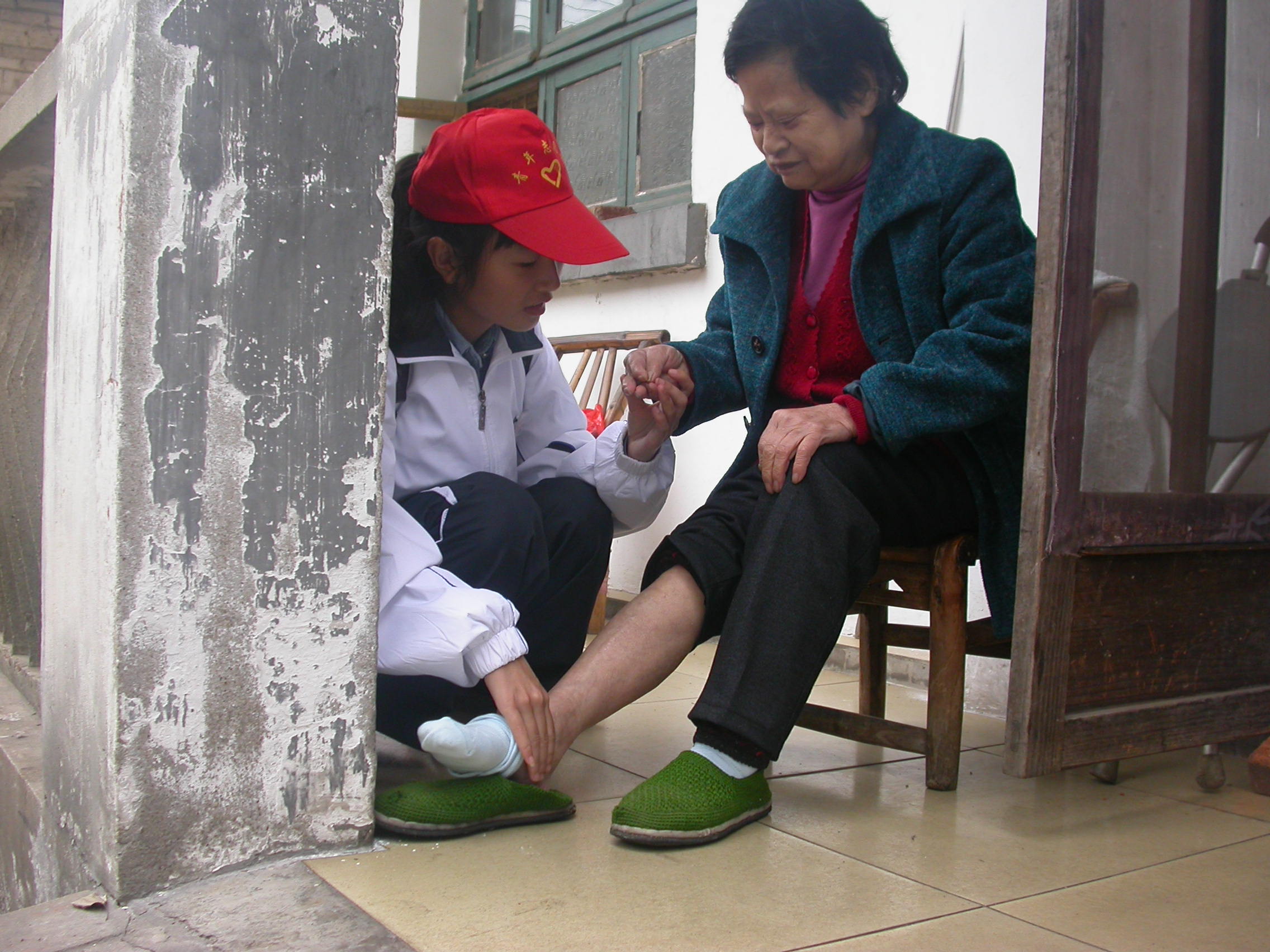 而后,同学们便迫不及待地与各位老人交流。虽然老人们身体有些不便,但都十分健谈,与团员们论学习、诉烦恼、讲历史,一时间,整个屋子便充满了欢声笑语。看到老人们显出些微疲惫,团员们就马上帮他们捶背揉脚,为他们减轻不适。