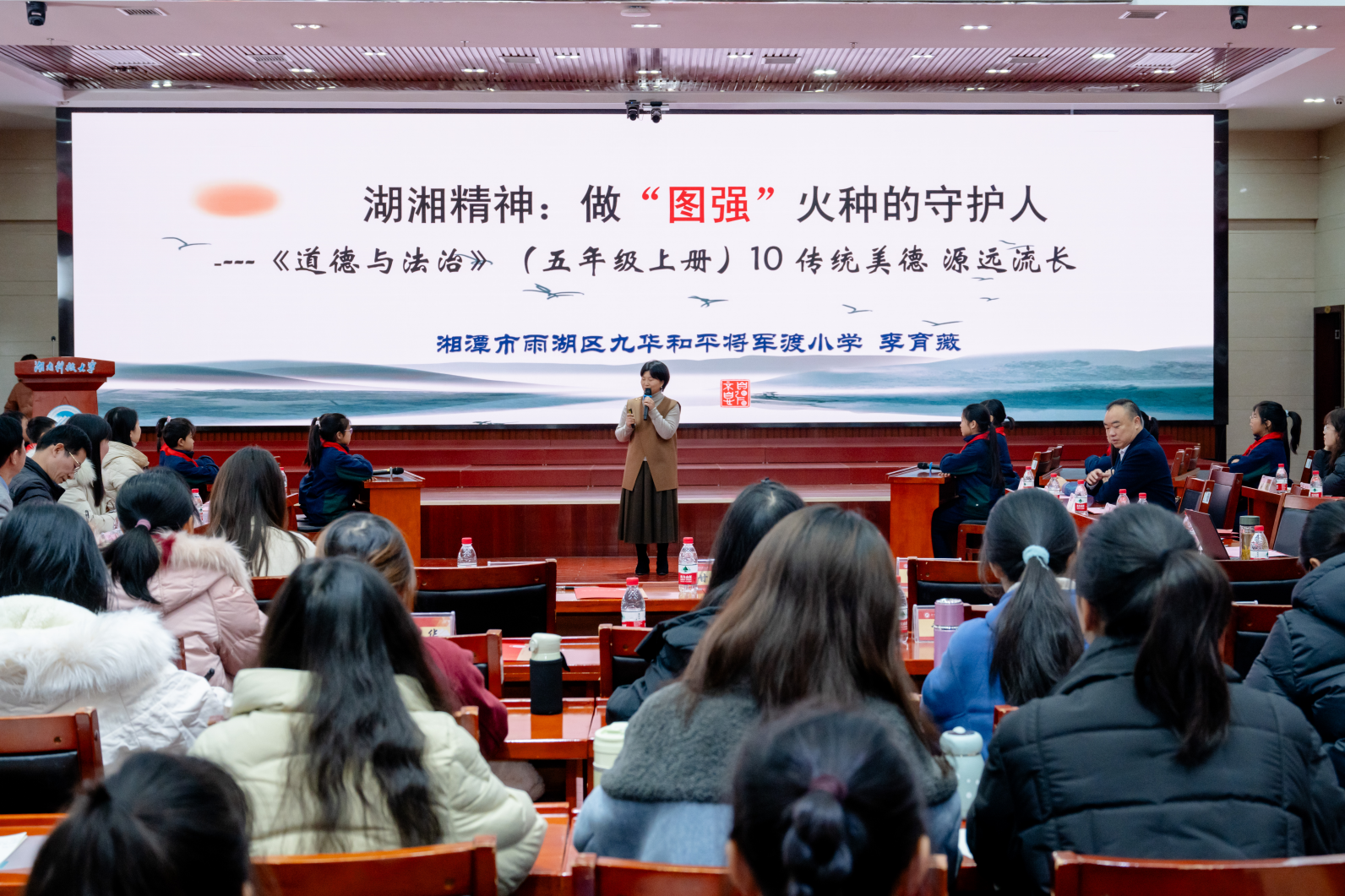 在小学学段,湘潭市雨湖区九华和平将军渡小学李育薇、湘潭市雨湖区九华和平小学杨越和湘潭大学附属实验公司周婷三位老师围绕教材知识点“《道德与法治》(五年级上册)10 传统美德 源远流长”进行教学展示。李育薇老师以“湖湘精神:做‘图强’火种的守护人”为题,从齐白石的事迹导入教学内容,引出“吃得苦、耐得烦、霸得蛮”的湖湘“图强”精神。杨越老师以“湖湘精神与“君有约”为题,由湘潭市响水乡黄君珏的个人故事引入教学内容,从湖湘英雄毛泽东、彭德怀、曾国藩、左宗棠等人的事迹中概括出“吃得苦、耐得烦、霸得蛮”的自强不息气节,并引导员工从身边、从自身故事中感悟何为湖湘精神。周婷老师以“‘吃得苦,霸得蛮’的湖湘人”为题,以彭德怀将军的事迹导入教学,引导员工概括彭德怀将军的崇高精神和介绍自己所熟悉的湖湘英雄人物,并引导员工思考在学习和生活中如何传承“心忧天下”的湖湘精神、传承“心忧天下”的湖湘精神,传承红色基因,厚植爱国情怀。湘潭市教科院教研员王飞从教师素养高、教学素材选取鲜活、教学活动重视综合性和实践性三方面肯定了三位老师的教学展示,同时也提出两点改进建议,即案例可以进一步具化、细化和教学内容进一步链接生活。