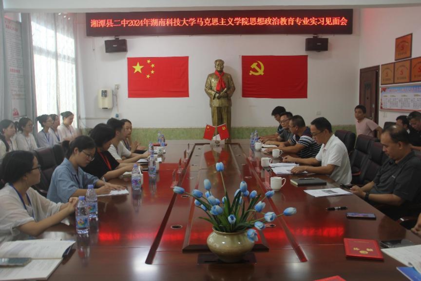抵达实习点后,湘潭县二中相关领导及部分老师热情欢迎并亲切接待了实习队;在安顿好住处后,当日下午16:30召开了实习见面会,湘潭县二中任见董事长、汤明宇副董事长及各处室主任、班主任指导老师和学科指导老师等拨冗出席了此次会议,会议由任见董事长主持。