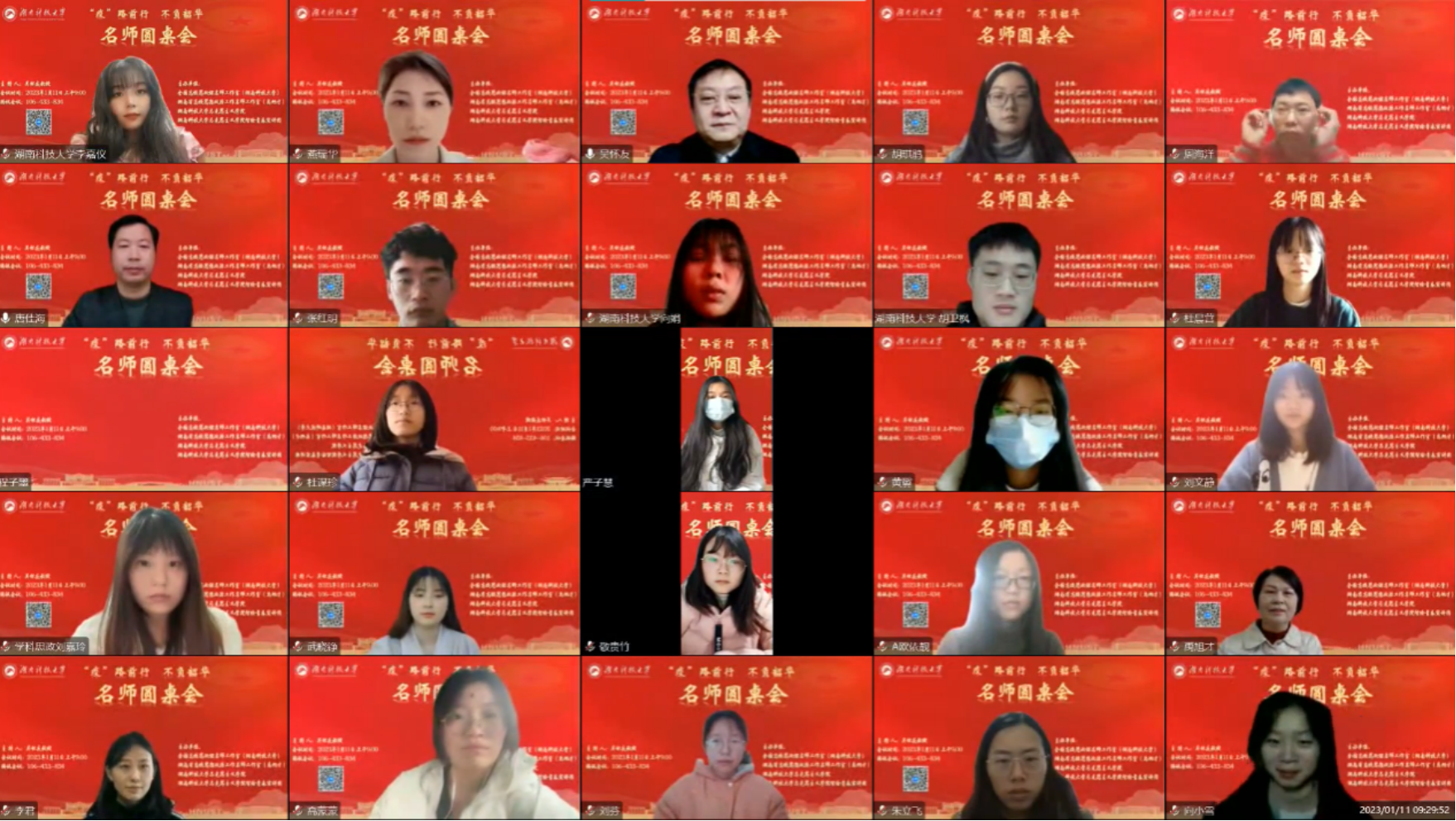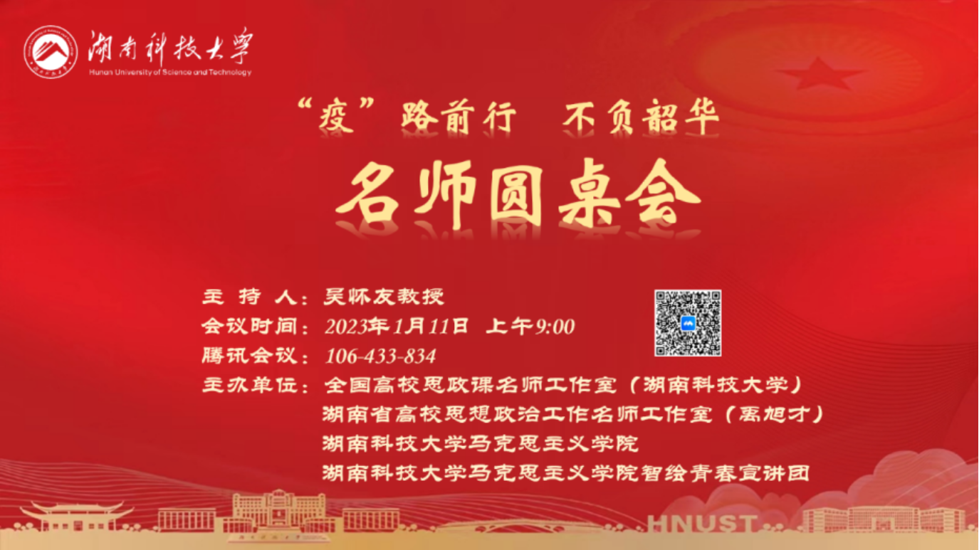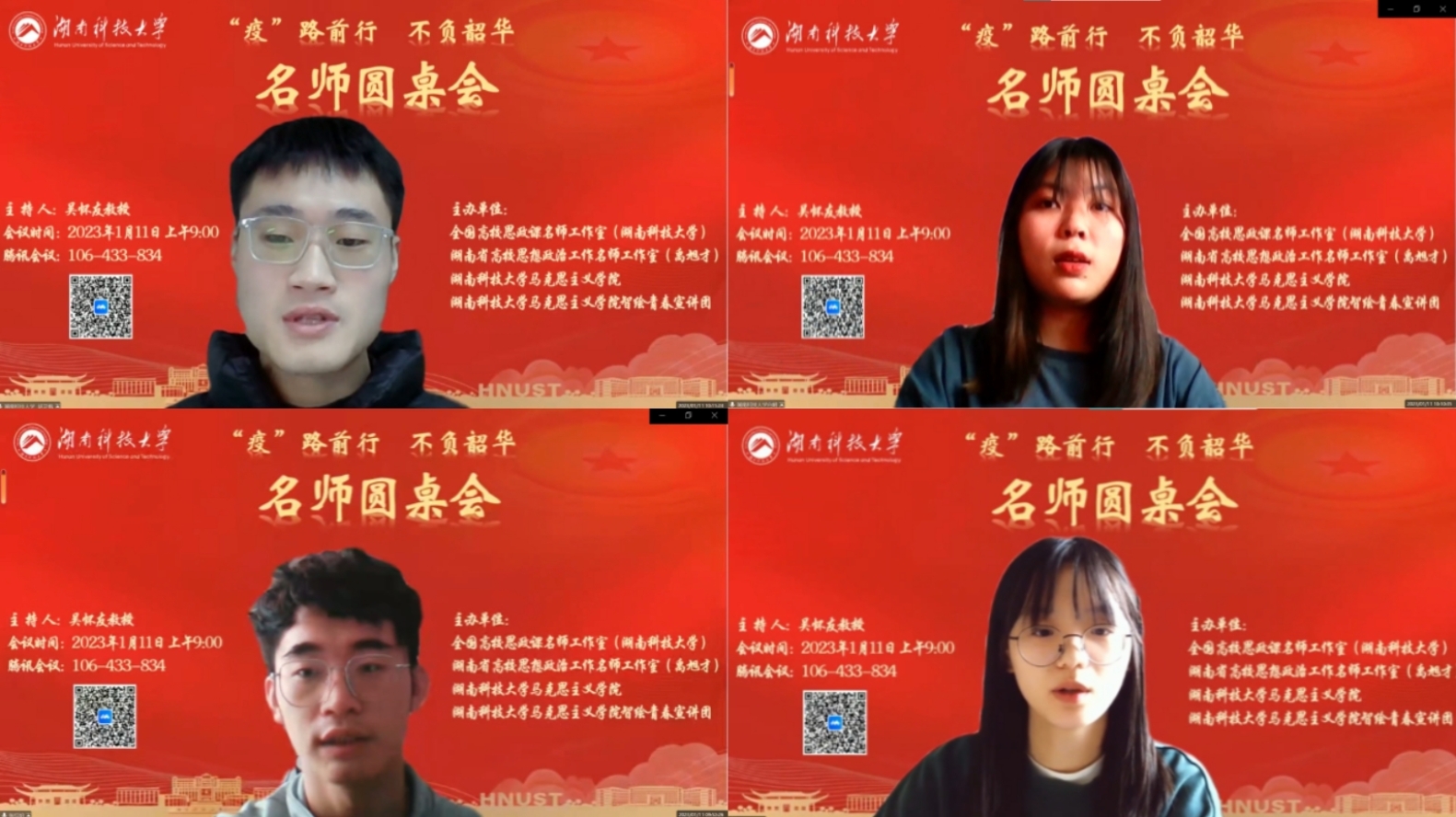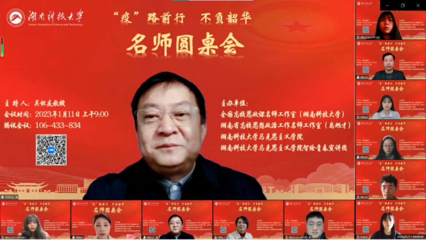 为进一步推动思政课教师下沉员工,形成老师关心员工、关爱员工、回应员工困惑的良好氛围,以提升思政课教学的针对性和实效性,1月11日上午,全国高校思政课名师工作室(304永利集团)、湖南省高校思想政治工作名师工作室(禹旭才)、304永利集团及智绘青春宣讲团通过腾讯会议平台联合举办了以“‘疫’路前行、不负韶华”为主题的名师圆桌会。本次圆桌会由全国高校思政课名师工作室(304永利集团)负责人吴怀友教授主持,名师工作室核心成员、304永利集团和江西师范大学304永利集团部分师生共70余人参加会议。