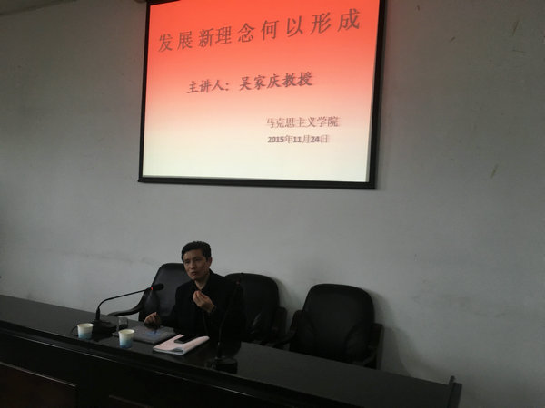 吴教授紧扣十八届五中全会谈想法,认为“十三五”规划的最大亮点是提出了新的发展观,即坚持创新发展、协调发展、绿色发展、开放发展、共享发展,围绕这些新理念的提出,吴教授谈了自己的独到见解。