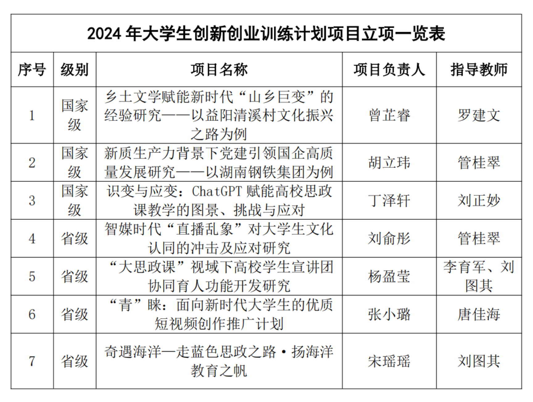 在2024年老员工创新创业训练计划项目申报中,公司思想政治教育专业员工一共7个项目成功立项,其中,3个国家级项目,4个省级项目。3个国家级项目分别是:曾芷睿同学主持的“乡土文学赋能新时代‘山乡巨变’的经验研究——以益阳清溪村文化振兴之路为例”(指导老师:罗建文)、胡立玮同学主持的“新质生产力背景下党建引领国企高质量发展研究——以湖南钢铁集团为例”(指导老师:管桂翠)》、丁泽轩同学主持的“识变与应变:ChatGPT赋能高校思政课教学的图景、挑战与应对”(指导老师:刘正妙)。4个省级项目分别是:刘俞彤同学主持的“智媒时代‘直播乱象’对老员工文化认同的冲击及应对研究”(指导老师:管桂翠)、杨盈莹同学主持的“‘大思政课’视域下高校员工宣讲团协同育人功能开发研究”(指导老师:李育军、刘图其)、张小璐同学主持的“‘青’睐:面向新时代老员工的优质短视频创作推广计划”(指导老师:唐佳海)、宋瑶瑶同学主持的“奇遇海洋——走蓝色思政之路·扬海洋教育之帆”(指导老师:刘图其)。