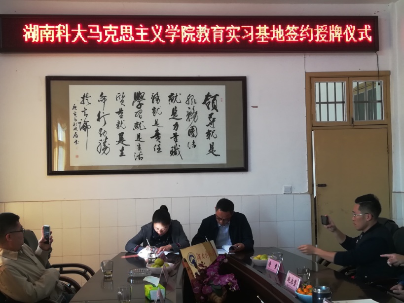湘潭县五中董事长王勇军、党总支书记梁迎新热情接待了公司领导与教师代表,并举行了教育实习基地签约座谈会及授牌揭牌仪式。湘潭县五中梁迎新书记发表了真挚感言,很乐意为母校师范实习生搭建平台,加强双方合作,共同进步。