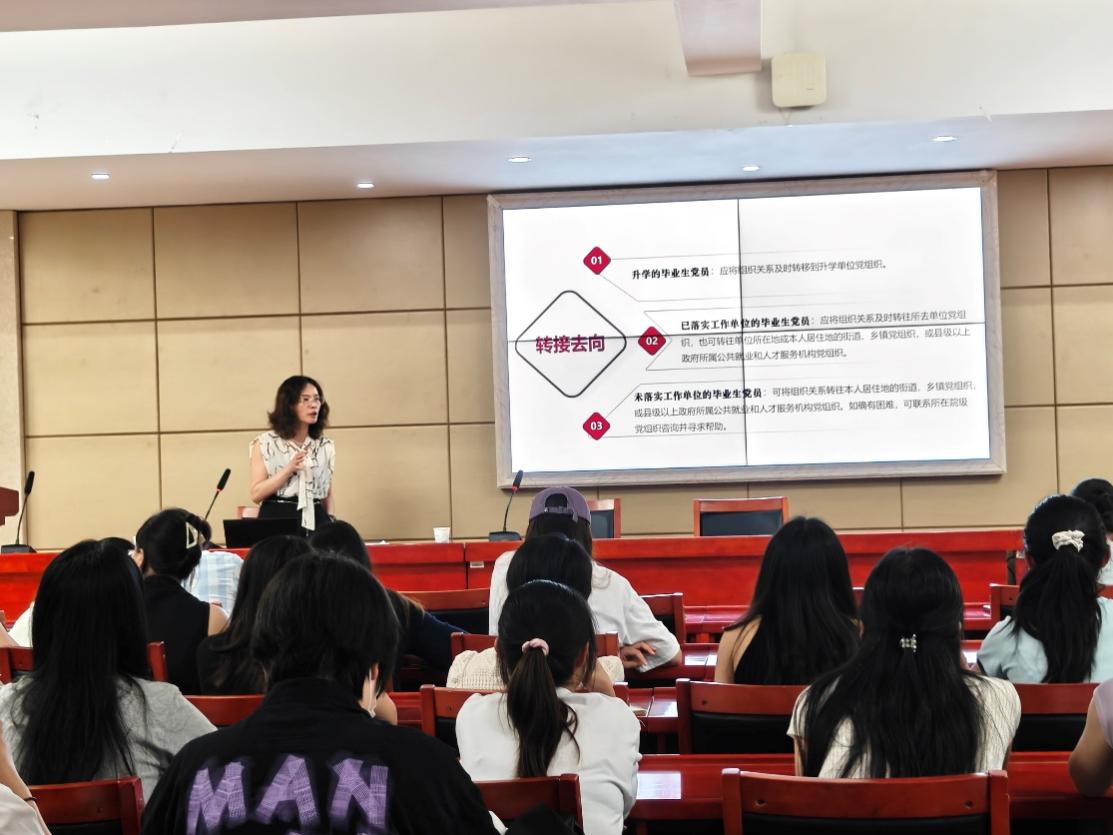 会上,刘美伶强调了毕业生党员组织关系的相关注意事项,她详细讲解了毕业生党员党组织关系转接及党员档案归档工作的具体要求和注意事项,明确要求全体毕业生党员要认真办理好党组织关系转接,确保党组织关系转接准确无误。