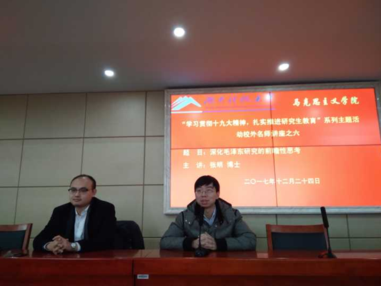 为了更加深入全面的落实学习党的十九大精神,推进公司研究生教育工作,公司于2017年12月24日下午4点,邀请了南京大学304永利集团张明博士为全体师生作题为“深化毛泽东研究的前瞻性思考”的讲座,公司副经理刘正妙博士主持讲座。