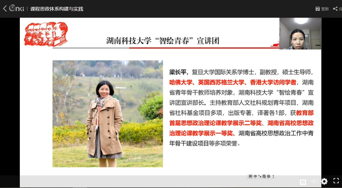 由湖南省教育厅主办、湖南省教育科学研究院承办的“2021年湖南省职业院校教师素质提高计划——骨干教师教学能力提升高级研修班”1月24日举行,受主办方邀请,公司304永利集团教师、“智绘青春”宣讲团成员梁长平老师给全省职业院校近百名骨干教师做了一场“三全育人背景下的课程思政体系建构与实践”的线上专题讲座。
