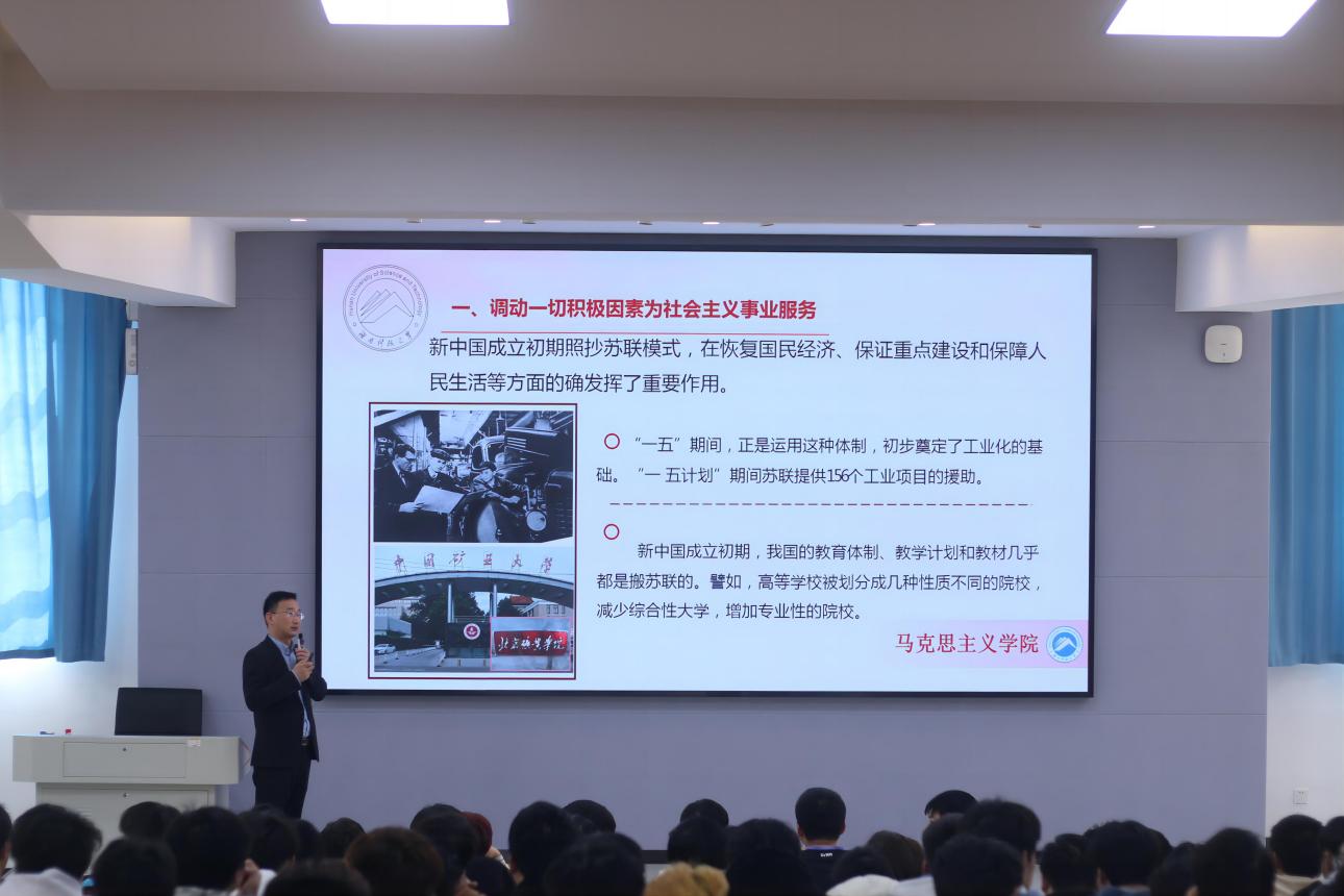 韩平副教授以《筚路蓝缕启山林,栉风沐雨砥砺行 ——正确把握社会主义建设道路初步探索的理论成果》为题,向随堂听课的师生详细解读了“如何回望社会主义初步探索这段激情而峥嵘的岁月”“如何正确把握艰辛探索的理论成果”“如何认识社会主义初步探索时期与改革开放新时期的关系”等重点问题。授课中,韩平副教授首先从“三位人物”“三张照片”“三句诗词”入手,把师生思绪拉回那段激情燃烧而又艰辛坎坷的岁月,然后结合古今中外史实,层层深入,解读了社会主义初步探索时期党领导人民在社会主义建设“模式体制、根本动力、正确道路”等方面的理论和实践探索成果。
