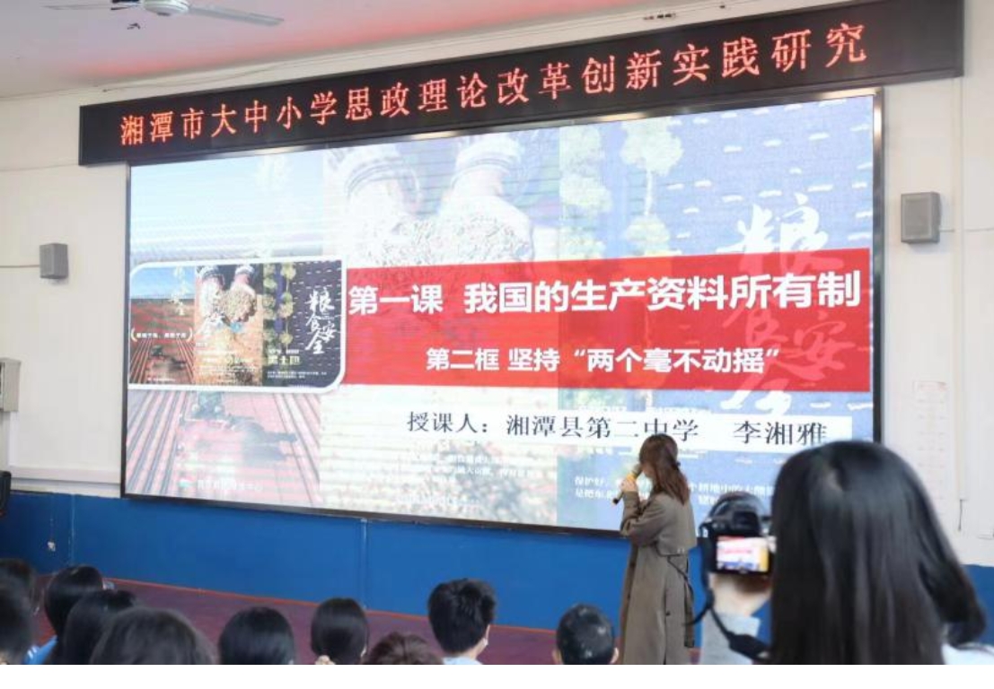 湘潭县二中教师张佳慧、李湘雅进行思想政治课理论课改革创新展示课。张老师利用G20峰会事例,通过议题式教学对《国际关系》进行授课;李老师采用小组调查、员工展示等教学方式,通过议题式教学对《坚持“两个毫不动摇”》进行授课。