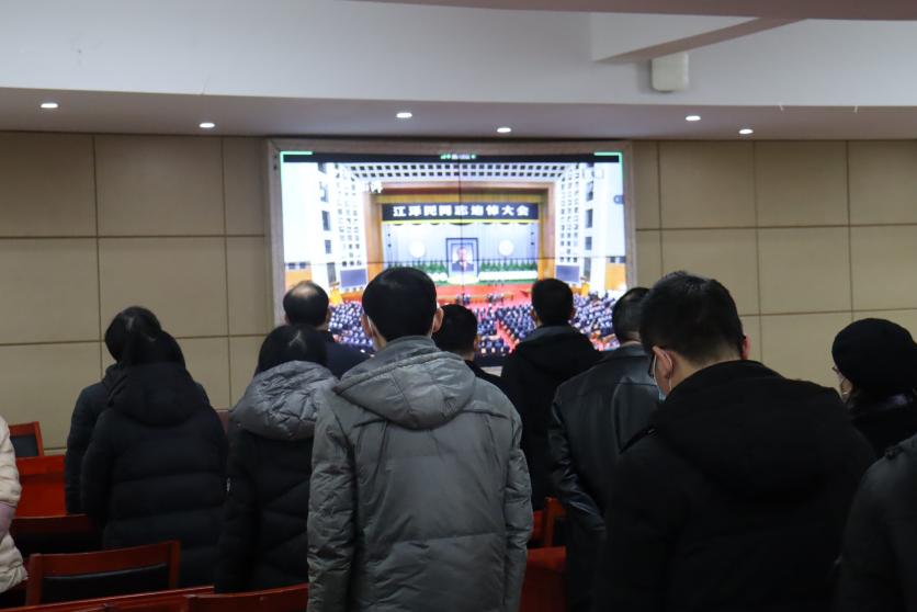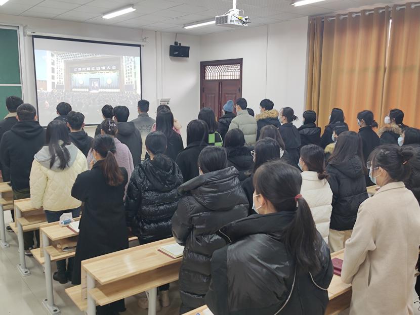 山河同悲,举国哀悼。上午10时,江泽民同志追悼大会开始。收看追悼大会的师生们着装肃穆、表情凝重,在悲壮的哀乐中默哀三分钟,向遗像深深三鞠躬,表达对江泽民同志的深切哀思。在追悼大会中,师生们认真聆听习近平总书记所致的悼词,深情追忆江泽民同志伟大光辉的一生,深刻感悟江泽民同志的精神风范。