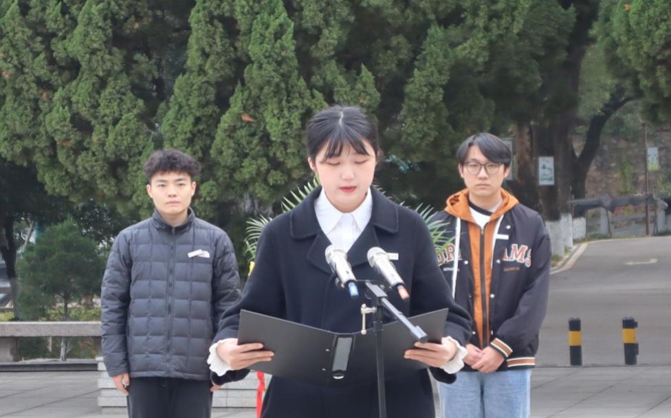 默哀完毕后,由“薪火湘传”宣讲团成员师雪阳同学为此次公祭日活动献词,表达对革命先烈的深远追思之情。她代表全体同学作出庄严承诺:“我们不会忘记,英烈们的牵挂和期许,您热爱的祖国,守护的山河,请放心交给我们!”