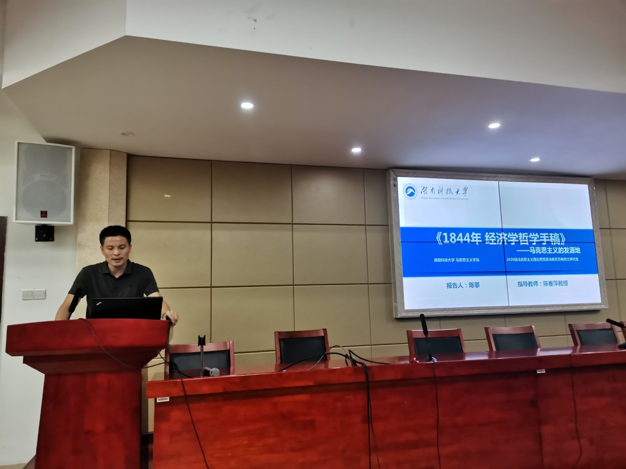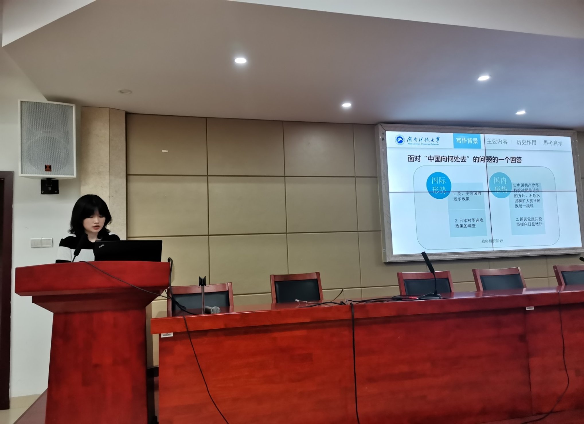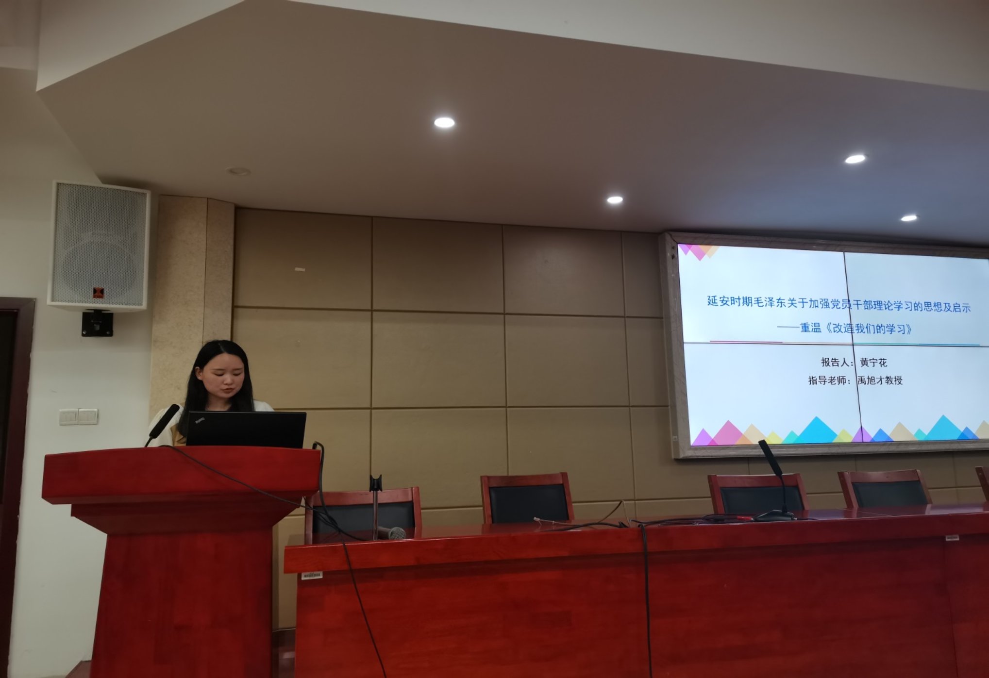 本次读书报告会一共有五名博士研究生进行读书汇报。首先是进行读书汇报的是刘建武导师指导下的胡涵同学,她带来的是《整顿党的作风》的读书报告,延安整风运动是中国共产党历史上一次全党范围内的普遍的马克思主义教育运动,也是一次伟大的解放运动。她从历史背景、主要内容和历史意义这三个方面分别论述,报告中谈到毛泽东写这篇报告的历史背景是因为中国革命必须由中国共产党领导及党内存在比较严重的“左”“右”倾错误的根源,最后胡涵同学呼吁大家要认真学习党史、新中国史,深刻认识红色政权来之不易,我们新青年必须牢记党的初心和使命,重视《整顿党的作风》的理论意义、现实意义和历史意义。第二位进行读书报告分享的是禹旭才老师指导下的黄宁花同学,她带来的是《改造我们的学习》的读书分享,她主要从写作背景与动机、主要内容、历史地位和当代启示及收获与体会四个方面来进行分享,其主要内容分为日益结合的二十年、目前学习存在的问题、对比经验主义和教条主义与马克思列宁主义相互对立的态度及“改造我们的学习”的方法四个部分来分析,读书报告最后提出自己的收获与体会,认为马克思主义创造性地揭示了人类社会发展规律,是我们立党立国的根本指导思想,必须正确把握学习的方向、把研究和解决重大现实问题作为学习的根本出发点、理论联系实际,处理好学习与应用的关系。第三位进行读书报告分享的是刘宇文老师指导下的侯钰婧同学,她为我们分享的是《新民主主义论》,她主要从历史背景、主要内容、历史作用、思考启示四个方面来阐述,报告中谈到毛泽东写这篇报告解决了两个革命阶段的衔接即如何“两步走”的问题、解决了落后的旧中国跨越“卡夫丁峡谷”的难题,为社会主义初级阶段理论提供了理论来源和实践经验。第四位进行读书报告分享的是黄永录同学,为我们分享的是《矛盾论》,主要从写作背景、主要内容、历史意义及启示来分享。其主要内容分为两种宇宙观、矛盾的普遍性、矛盾的特殊性、主要的矛盾和主要的矛盾方面及对抗在矛盾中的地位,最后黄永录同学呼吁大家解决问题要具体问题具体分析,用全面的、历史的、发展变化的观点看问题,办事情要善于抓住重点、抓主流,集中主要力量解决主要矛盾。最后为我们分享的是陈春萍老师指导下的陈攀同学,他分享的是《1844年经济学哲学手稿》,主要从作者简介、写作背景、重要思想及意义影响来分享,《1844年经济学哲学手稿》是马克思主义形成过程中即马克思早期思想发展中的一部重要著作。其重要思想主要以异化劳动概念为核心的政治经济学批判、以扬弃私有财产为核心的共产主义学说及对黑格尔唯心主义哲学的批判,他认为《手稿》既是马克思对人的现实关怀的重要起始点,也是马克思主义关于人的发展的价值理想论述的重要著作,现在重新解读这一文献不仅是对马克思及其思想的重视与信仰,更展现着中国所坚定的道路自信、理论自信、制度自信、文化自信。