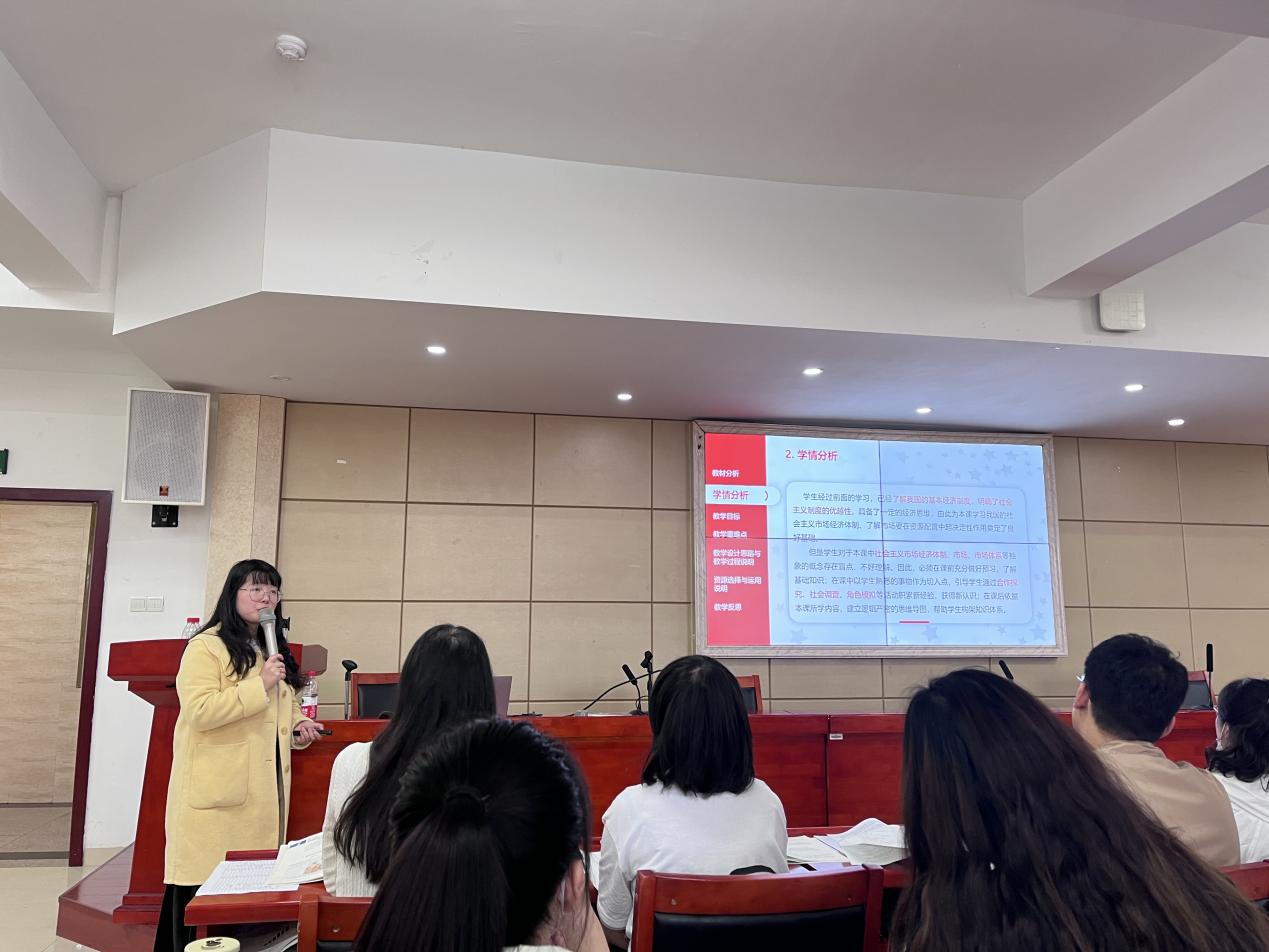 活动现场,湘潭县第五中学李依老师以《使市场在资源配置中起决定性作用》为题,从教材分析、学情分析、教学目标、教学重难点、教学设计思路与教学过程说明、资源选择与运用说明、教学反思等7个方面进行了高中思政课说课展示。她围绕富有时代性激发员工辩证思考的议题,以新能源汽车行业发展现状视频引导员工进入情境,让员工代入商家角色进行辩证思考。李老师的精彩说课展现了青年中学思政课教师敢于创新风采面貌。