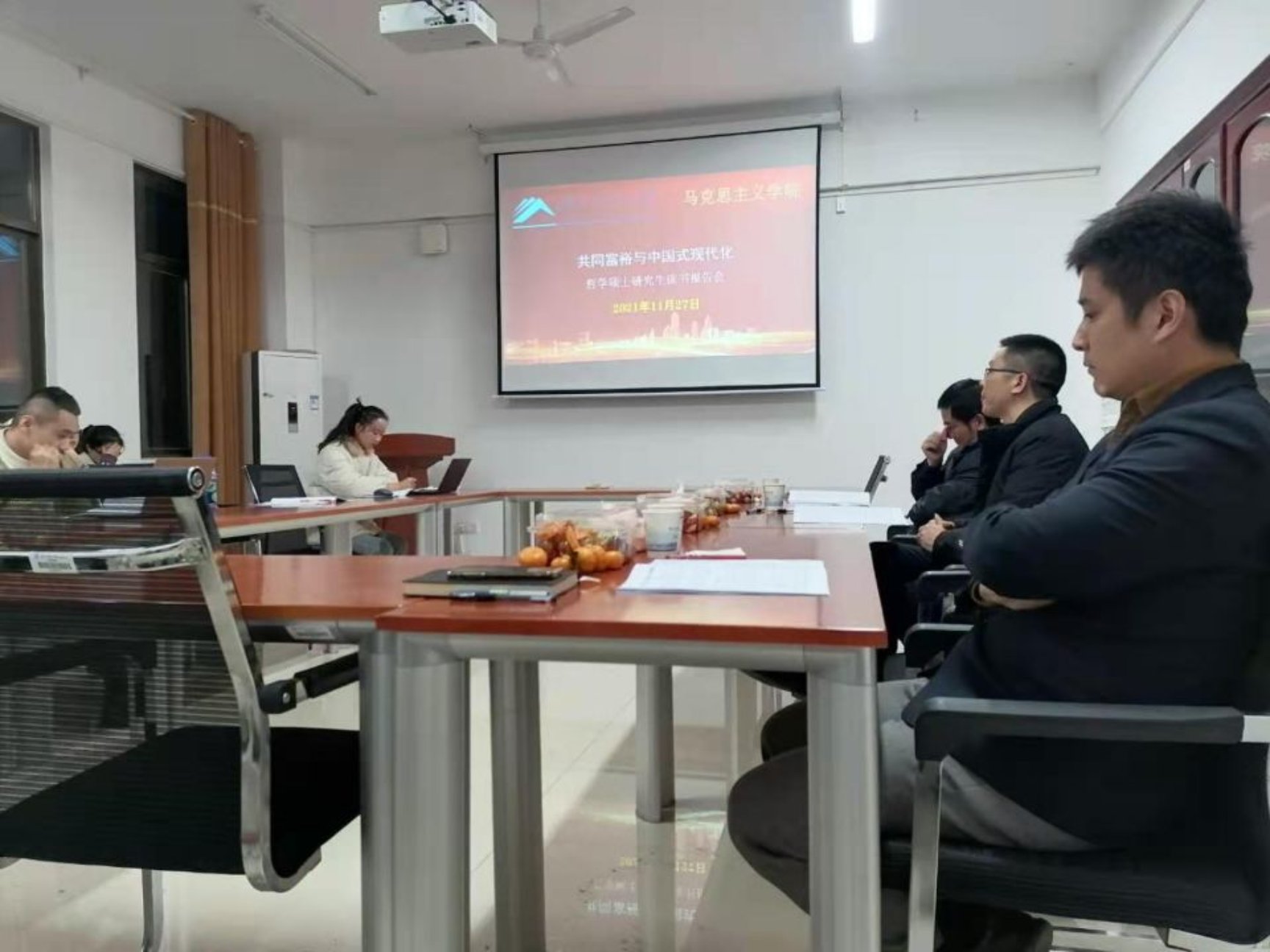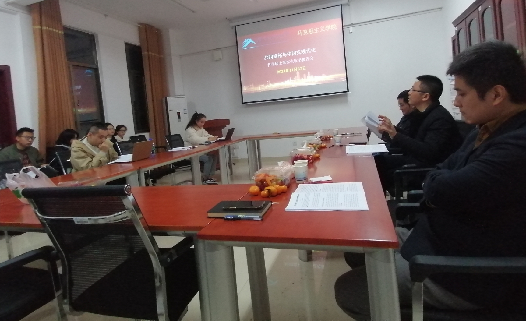 为营造良好的学术氛围,增进研究生的学术热情,进一步加强研究生对哲学和习近平新时代中国特色社会主义思想的学习与研究。公司哲学硕士学位点于2021年11月27日晚7点30分在立言楼A630举办以“共同富裕与中国式现代化”为主题的读书报告会。本次报告会由颜中军老师主持,汪隐峰、温航亮老师参与指导,全体哲学研究生到场参加讨论。