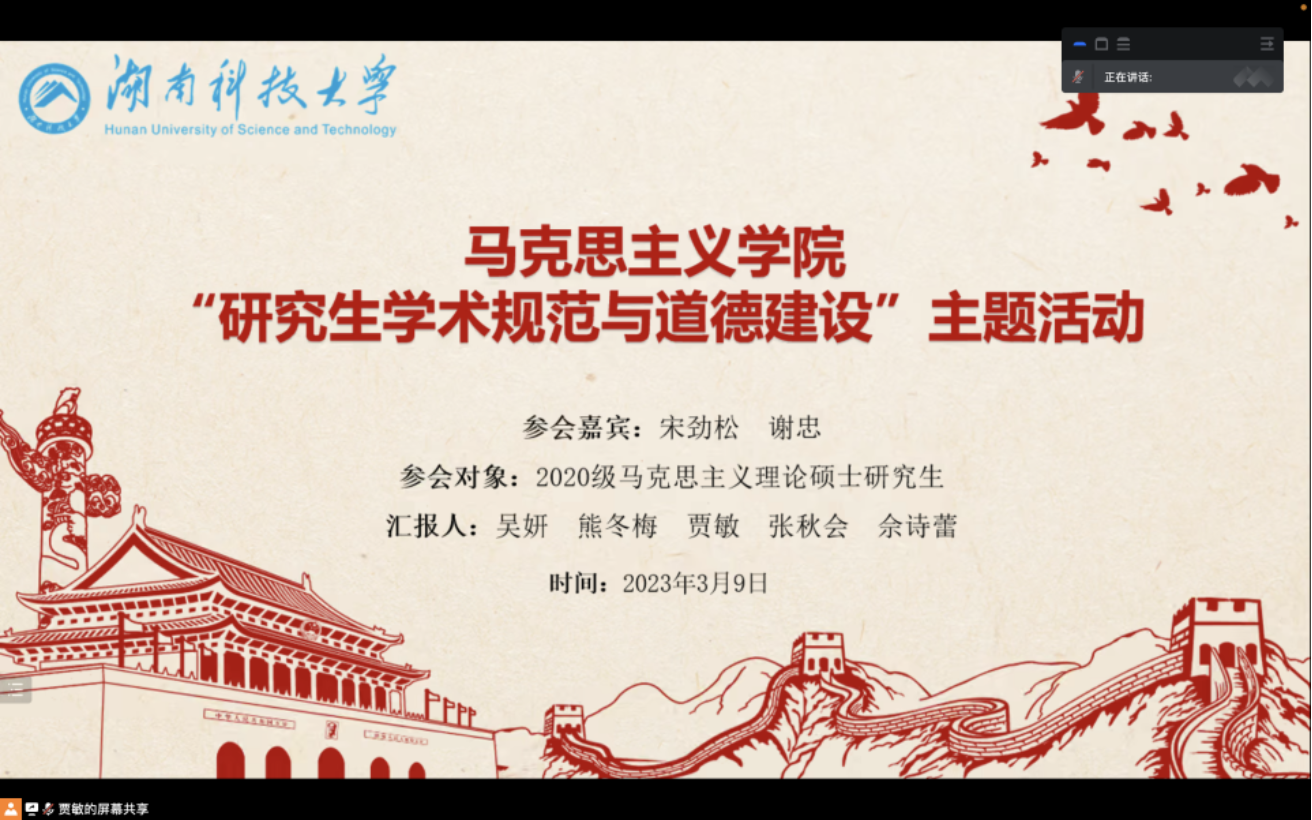 为深入贯彻落实全国高校思想政治工作会议和全国研究生教育会议精神,引导研究生树立良好科研习惯,明确最基本的学术规范与道德要求,端正学术之风,营造良好的科研环境,3月9日晚,公司于线上开展“研究生学术规范与道德建设”主题活动,公司宋劲松副经理、谢忠教授与会指导,20级马克思主义理论专业全体研究生参加。