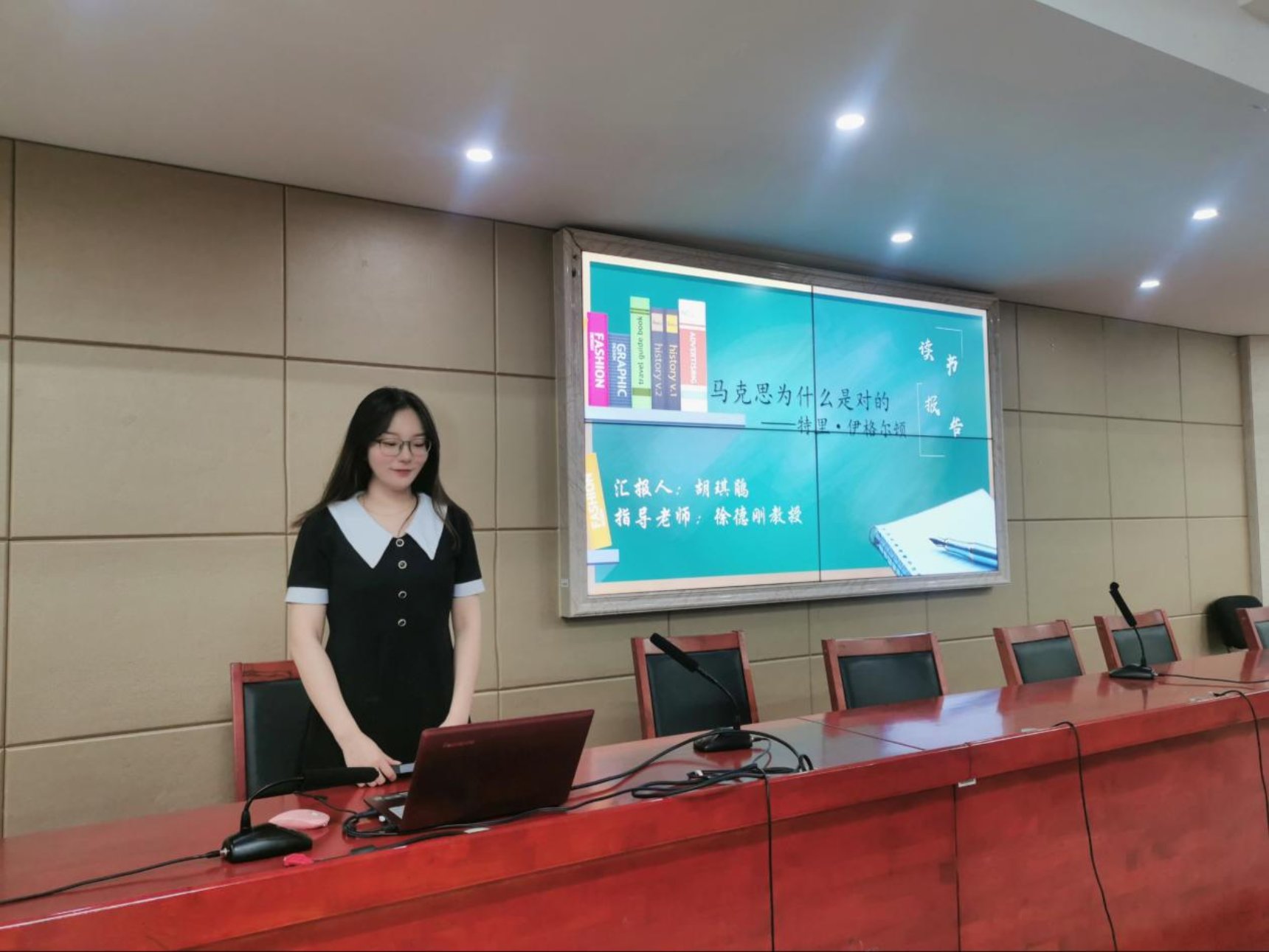 报告会上,首先是中国近现代史基本问题研究方向的霍青华分享了自己学习毛泽东《党委会的工作方法》的读书心得,他从其历史背景、主要内容及重要意义三个层面展开论述,重点讲述了党委会12个方面的工作方法和坚持民主集中制、守纪律讲规矩等重点精神,最后就自己的所读提出所思所悟所感。其次是马克思主义中国化方向的蒋冲以《在扩大的中央工作会议上的讲话》为中心的考察为出发点,浅谈了毛泽东的民主集中制思想。该《讲话》以探究毛泽东强调坚持民主集中制的原因和目的为历史背景,重点阐述了毛泽东民主集中制思想的根本遵循、核心要义、内在要求及其必然选择。最后蒋冲同学就该讲话目前研究已取得的相关研究成果,如学术著作、研究热点等简要进行分析。最后是中国近现代史基本问题研究方向的胡琪鹃分享了阅读特里·伊格尔顿所著《马克思为什么是对的》一书后的思考感悟。她就该书的驳马克思主义终结论、宿命论、乌托邦论、机械唯物论、阶级痴迷论、暴力革命论、极权国家论、地位边缘论等主要内容加以分析论证,并得出“马克思,一位被严重曲解的伟大思想家”的重要结论。