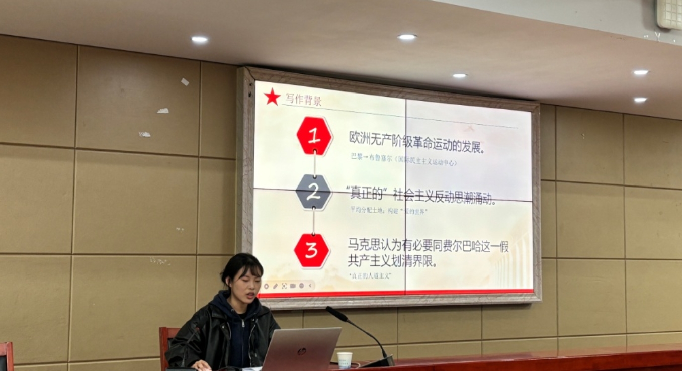 王洪泽同学分享了卡尔·马克思与弗里德里希·恩格斯合著的《德意志意识形态》,从写作背景与动机、主要内容、历史唯物主义方法、当代启示进行了读书汇报。其中,对唯物主义的方法做了详细的说明。在汇报的过程中,她融入了很多自己对于《德意志意识形态》的理解。朱春晖老师和王霞老师对王洪泽的读书报告作了详细的指导,同学们也从中学习到了很多。