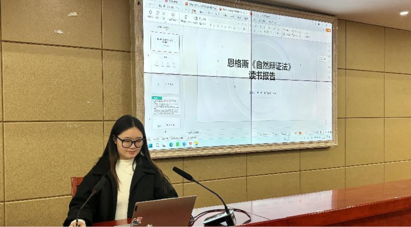 徐千涵分享的是弗里德里希·恩格斯的《自然辩证法》。她分别介绍了本书的写作背景、主要内容、理论地位、当代价值,并着重讲解了本书的主要内容以及当代意义。最后,她从三个方面分享了本书对当代中国的价值的心得体会,其中包括“人与自然关系的认识”“经济社会的可持续发展”“生态文明建设”。朱春晖老师和王霞老师给徐千涵提出了许多具有建设性的建议,如需要加深对书本内容的理解,以及本书在马哲方面的贡献等。同学们都认真聆听,并重点做了笔记。除此之外,还对徐千涵同学的精美PPT,以及洪亮的声音作出了表扬。