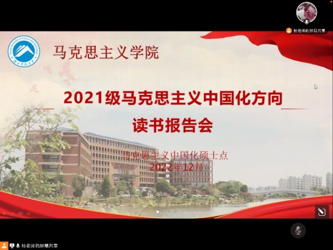 为深入学习研究党的二十大精神和《习近平谈治国理政》第四卷,2022年12月20日,公司马克思主义中国化方向举行了线上读书报告会。此次报告会由杨松菊老师主持,曾祥炎老师、唐小芹老师、梁长平老师莅临指导,马克思主义中国化方向全体硕士研究生参加。